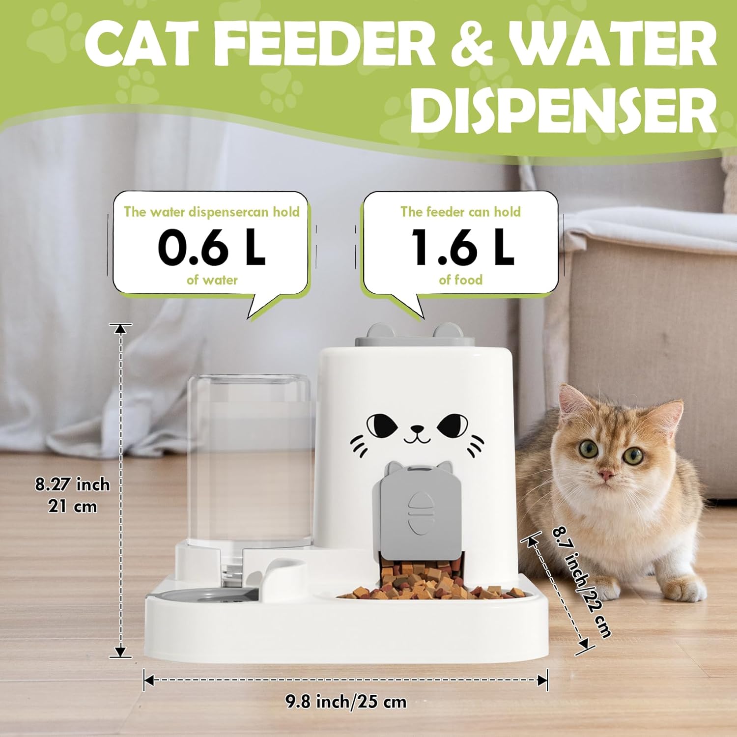 The cat feeder and water dispenser set, hold up to 0.6L food and hold about 1.6L water.