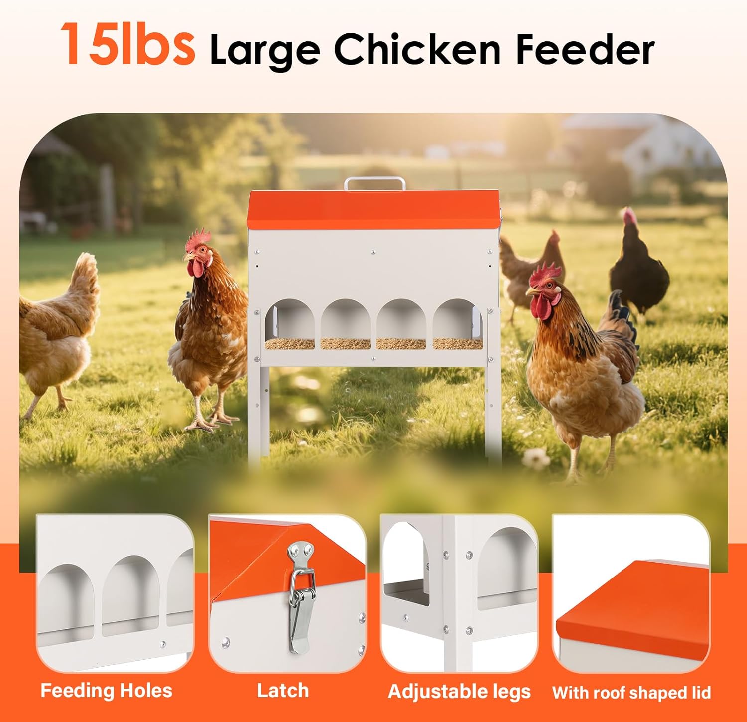 Heavy Duty Material: 15lbs Automatic chicken feeder with handle is made of stainless steel, which offers durability and can withstand extreme weather conditions