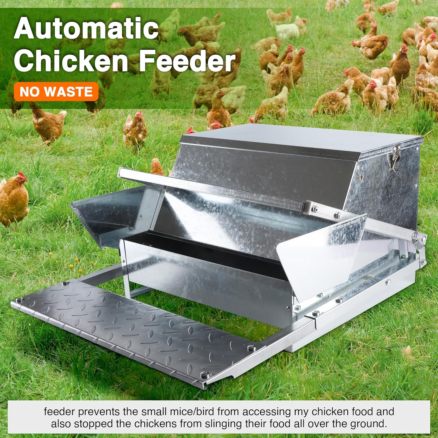 🐓 Reduces Feed Waste 🐓 The unique feeding platform of this automatic chicken feeder helps prevent chickens from spilling or scattering their food, reducing waste and saving you money in the long run.