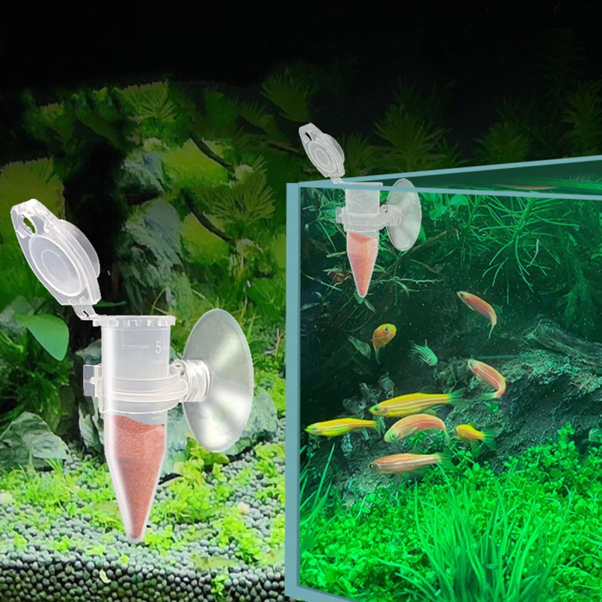fish tank food feeder Easy to operate and use, suitable for all kinds of freshwater aquariums, shrimp and small tropical fish feeding.plastic feeding cone cup A great accessory for fish tank.aquarium fish feeder This item is a shrimp food feeding container, made of plastic material, and use