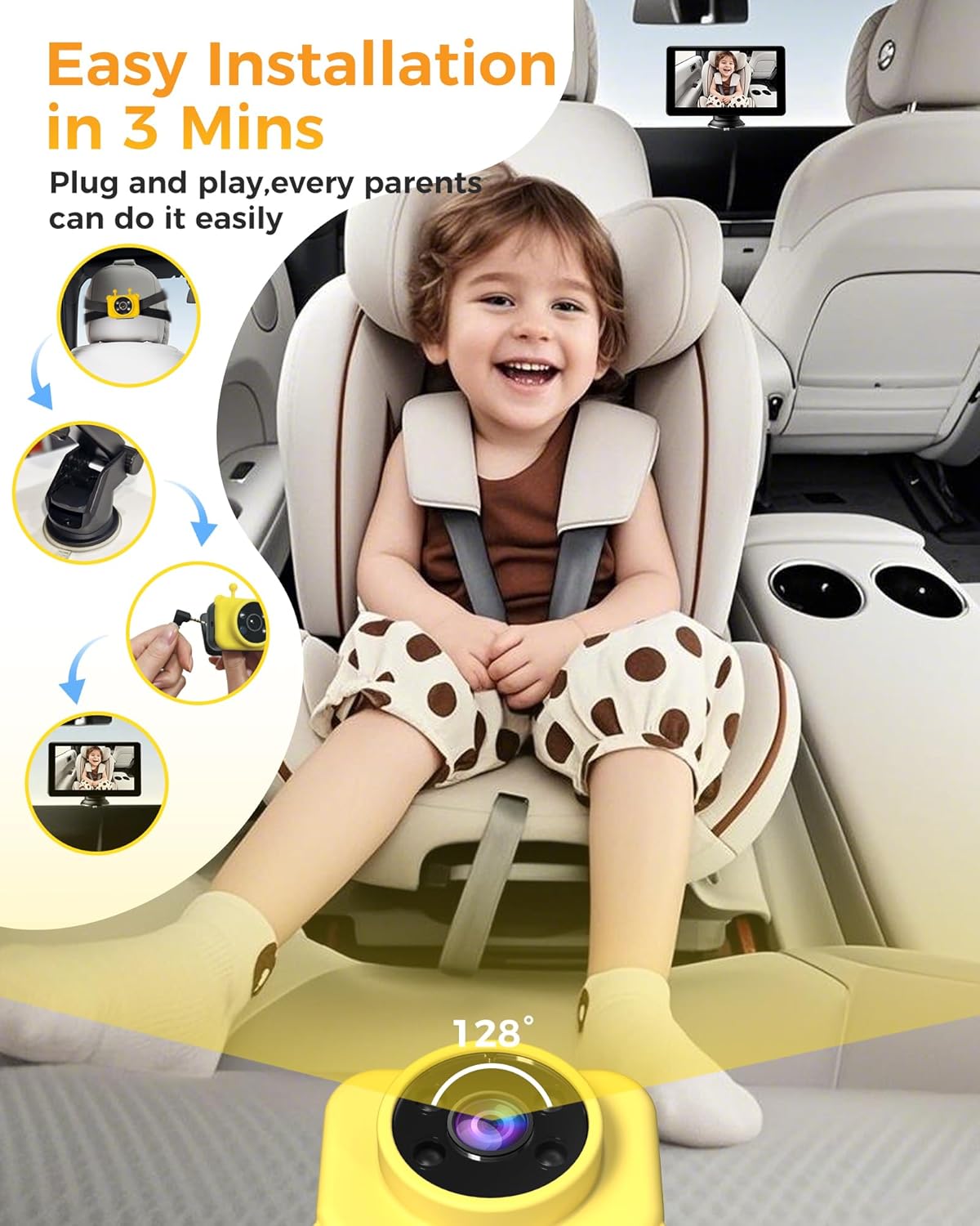 360° Adjustable Rotating Camera with 150° Wide Viewing Angle:The 360° rotatable camera offers flexible positioning, while the 150° wide-angle lens ensures maximum coverage of the backseat. Paired with a sturdy vacuum suction cup, this baby car camera stays securely in place on any road condition, providing a clear view of your baby, pets, or rear passengers.