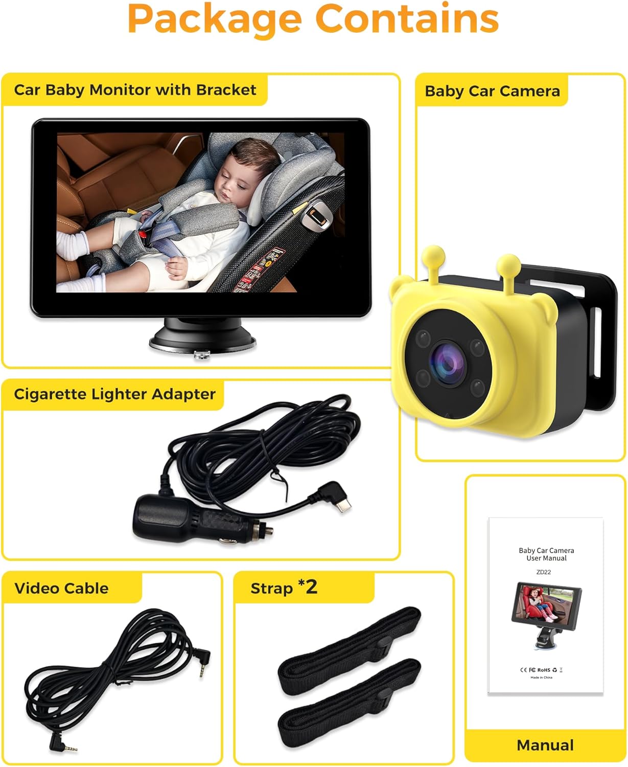 Easy Installation in Just 3 Minutes:Installing this baby car camera is a breeze! Simply connect the cable to the dashboard monitor, plug the power cord into the cigarette lighter or USB-C port, and you’re ready to go. The universal compatibility works with vehicles equipped with 12V to 24V systems, making it a perfect fit for most cars.