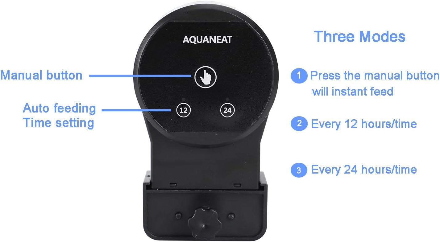 【Manual and Automatic Mode】: Press the manual button to feed immediately. Press the time button to set the feeding interval to be 12/24 hours, and the feeder will automatically feed the fish at the time you set.