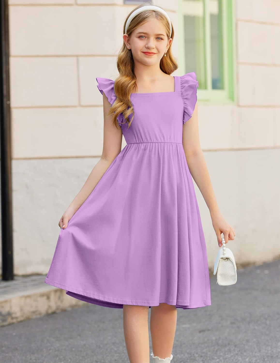 Girls Short Flutter Sleeve Casual Elegant A-Line Swing Dresses