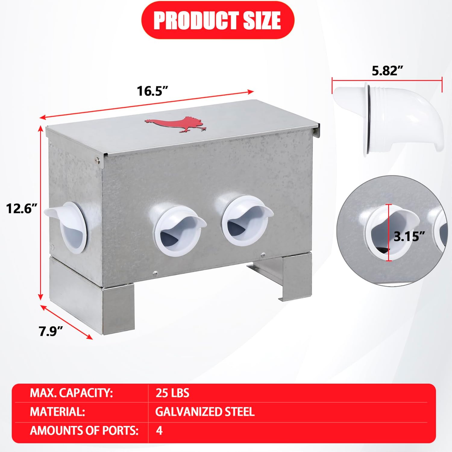 🪿Built To Last: The feeder is made of high-quality galvanized metal, which offers durability and can withstand extreme weather conditions. The inlet is made from PP plastic.