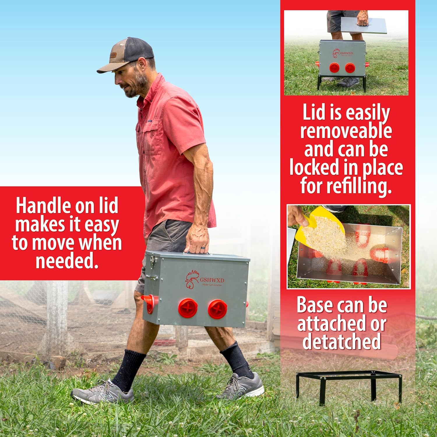 [HIGH QUALITY MATERIAL]: The feeder body is made of thickened galvanized metal, which is durable and can withstand harsh weather and the test of time better than most plastic chicken feeders. The feed ports are made of high-quality plastic and each comes with a cover that you can open and close at any time.