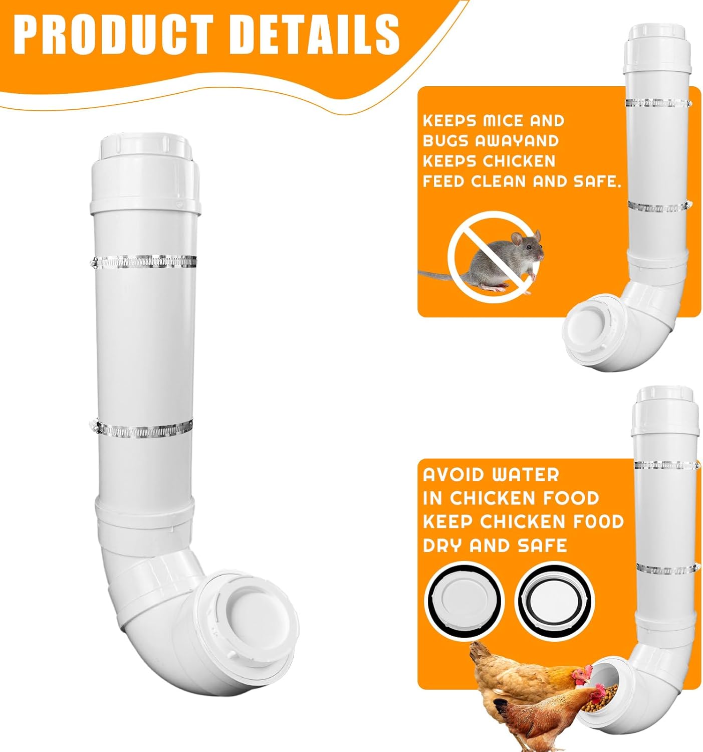 Our products are made of thick PVC pipe, which is very easy to install and use. The product comes with 2 LIDS, which can prevent rain from entering and small animals such as mice from eating chicken feed, and the 6.6-pound capacity allows you to avoid adding feed frequently. It’s your ideal automatic chicken feeder