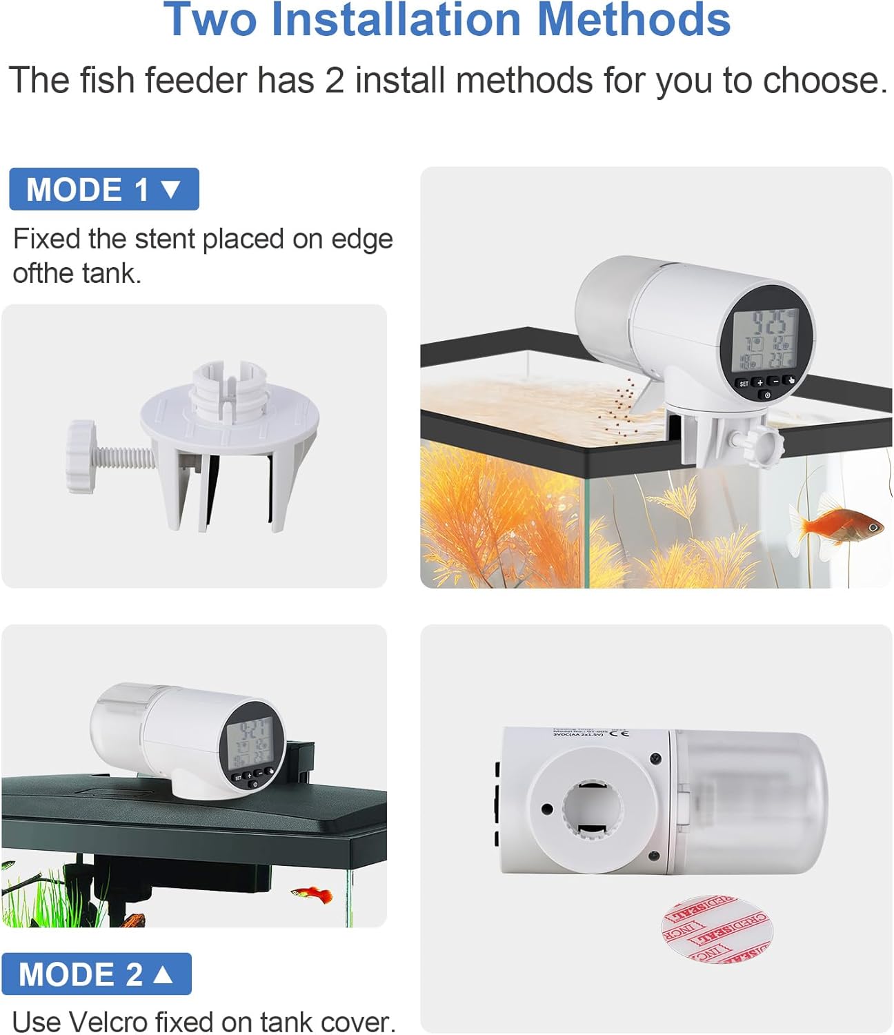 2 Installation Ways- Our automatic fish feeder for aquarium is designed with a rotatable base for vertical fixing and attached with a paste sticker for plane fixing on the fishtank, which is easy to operate.
