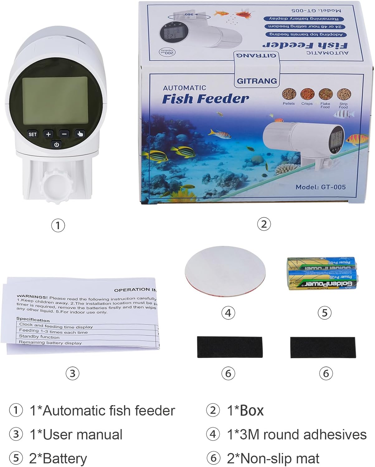 Moisture-Proof Design: The electric feeder adopts moisture-proof design to ensure the freshness of food. No blockage will occur. Large capacity: 200ml large-capacity feed bucket fish feeder automatic dispenserThe feeder is suitable for fish food such as strips, powder , granules, and flakes.
