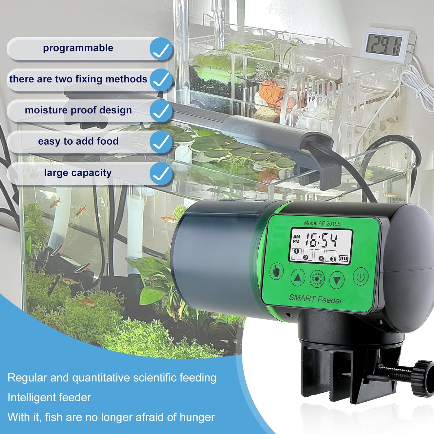 [Suitable for multiple types of food]: Capable of accommodating various forms of fish food, including pellets, trays, strips, and flakes, adapting to the dietary habits of different fish species. With a capacity of 200ml, its large size holds enough food to keep your fish fat while you’re away. Hatch style feed door is completely adjustable, allowing you to decide how much food is dispensed at each meal