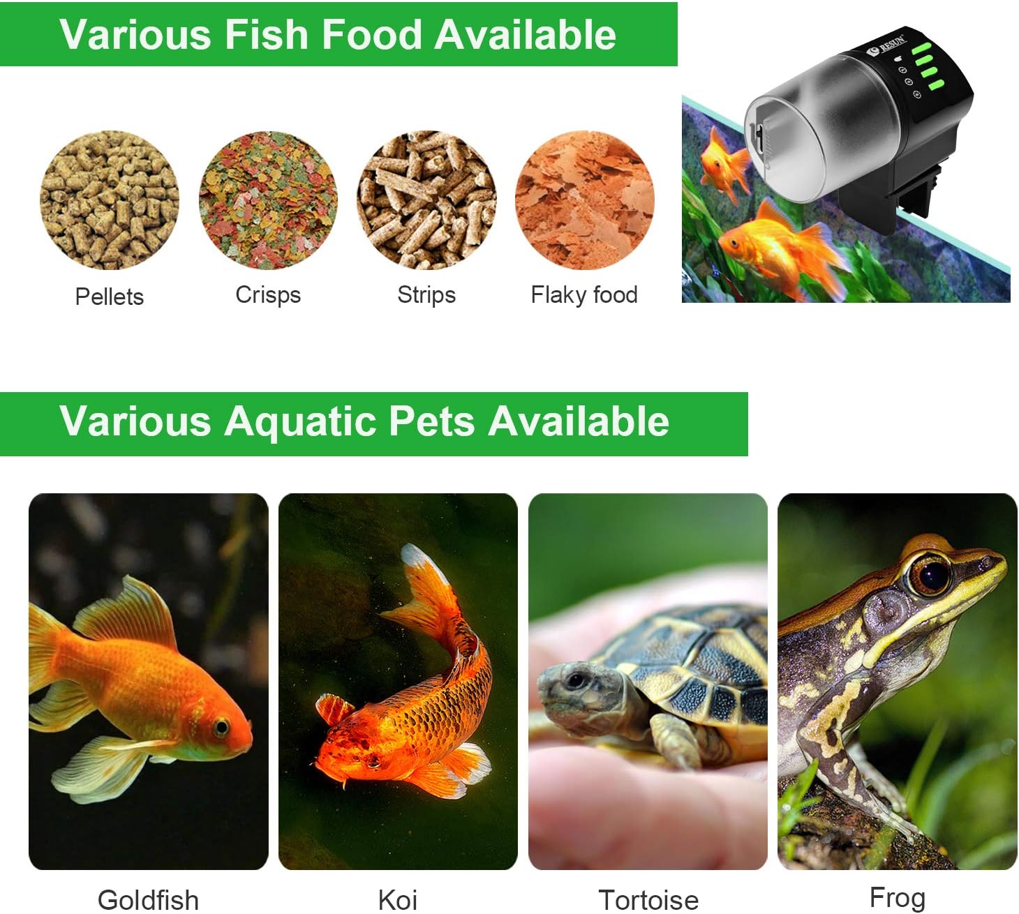 SUITABLE FEEDER: The feed boxes can accommodate Pellets, Crisps , Strips , Flaky food. The feeder can perfectly feed goldfish, Koi and turtles on weekends or holidays. Any problem pls contact customer service.