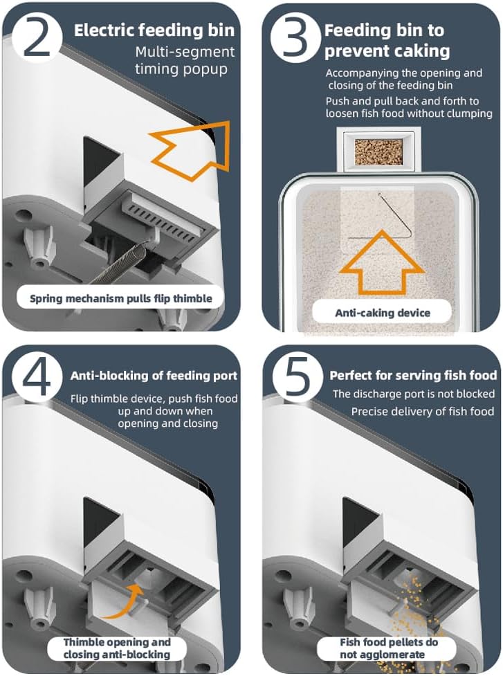 🐟Electric feeding bin: built-in anti-caking device, spring device pulls the flip pin, pushes and pulls back and forth with the opening and closing of the feeding bin, so that the fish food is loose and not lumpy.