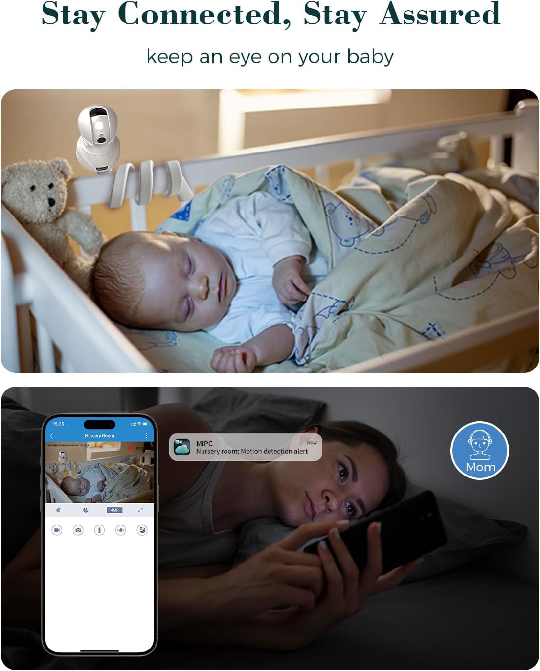 【Stay Comforted Anywhere】Support 2-way audio, talk and comfort your baby from the convenient MIPC app when you are not accompany him. Customize thresholds for cry/motion to receive instant notifications and ensure you’re always aware of your baby’s needs