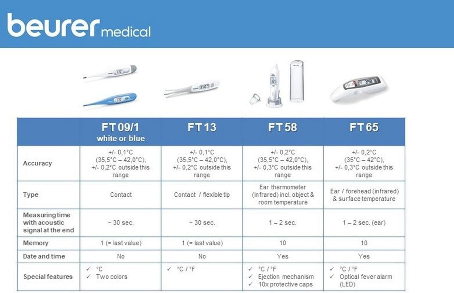 No FUSS, no hassle.The Beurer FT58 ear Thermometer is a great addition to any household. The thermometer can be used both for adults and children. Getting a young child or baby to cooperate with a classic-style thermometer can be a struggle. That is why the FT58 was designed with both parents & children in mind. Hygienic and safe, The thermometer provides a quick & accurate reading while placing the thermometer comfortably in the ear. The unit includes 10 protective hygienic Caps – additional replacements are available for purchase.The Beurer FT58 has 10 memory spaces, so you can access as well as monitor past readings & measurements over time. This makes it convenient to share with your physician or child’s pediatrician. The unit has both a fever symbol function and a fever alarm function.Fever symbol: the display shows either a smile or frown symbol/icon according to the result of the measurement. The smiley Face symbol indicates that the body temperature measured is below 100.4&Deg; F. The sad face symbol indicates that the body temperature is equal to or higher than 100.4&Deg; F. If the acoustic signal is switched on, three Beeps will sound once the measurement is complete if the temperature is equal to or higher than 100.4 ° F.Fever alarm: the fever alarm signals according to the result of the measurement. If the measured body temperature is between 99.5 and 100.3&Deg; F, two short Beeps will sound indicating an elevated temperature. If the measured temperature is equal to or higher than 100.4°F, a short, long and three short beep sounds In succession.Specifications: forehead temperature temperature room temperature fever symbolfever alarm with smiley icons 10 memory spacesstorage case & stand included batteries included