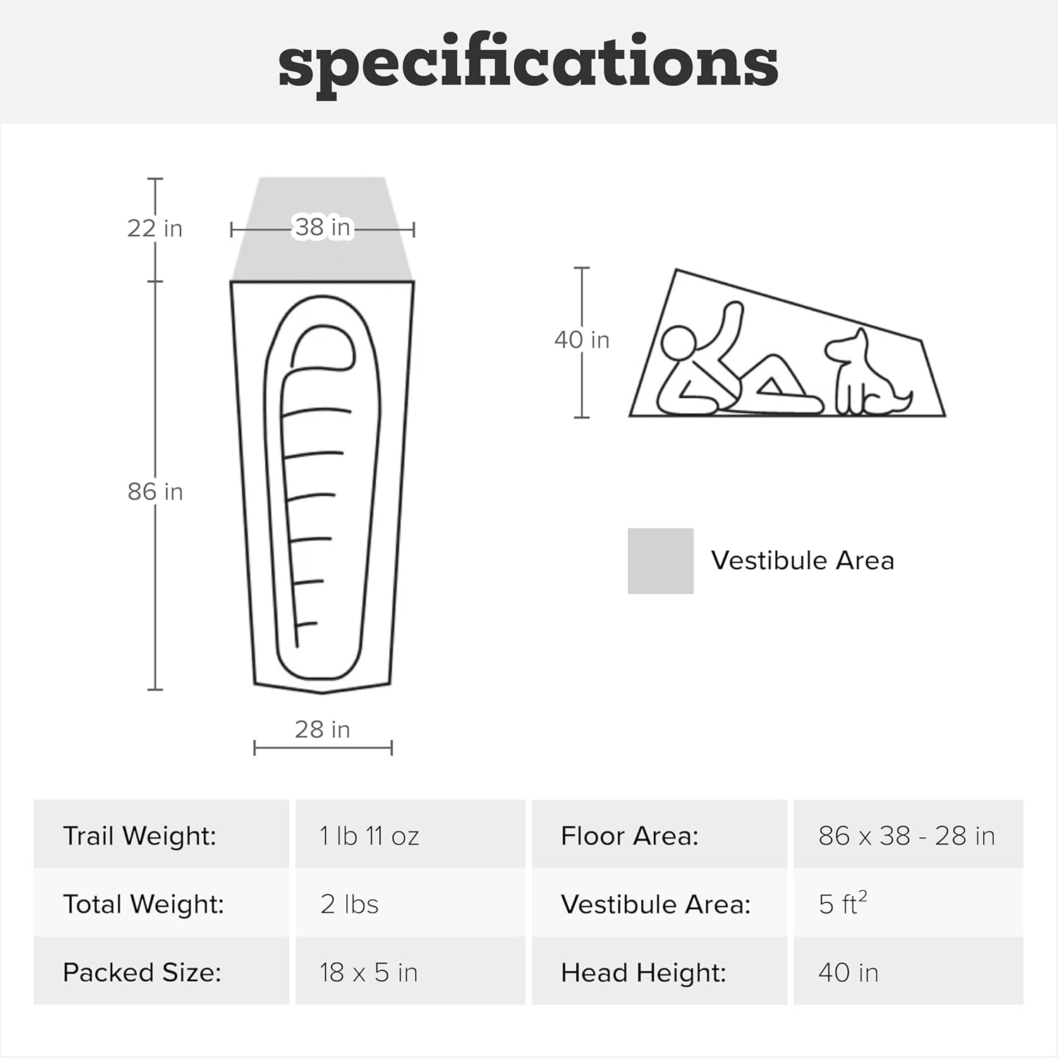 Maximized Living Space – High-volume architecture with DAC tent poles creates vertical sidewalls for increased interior space. Single door design with dry entry vestibule and structured foot-end corners provide comfortable tent camping despite the minimal weight