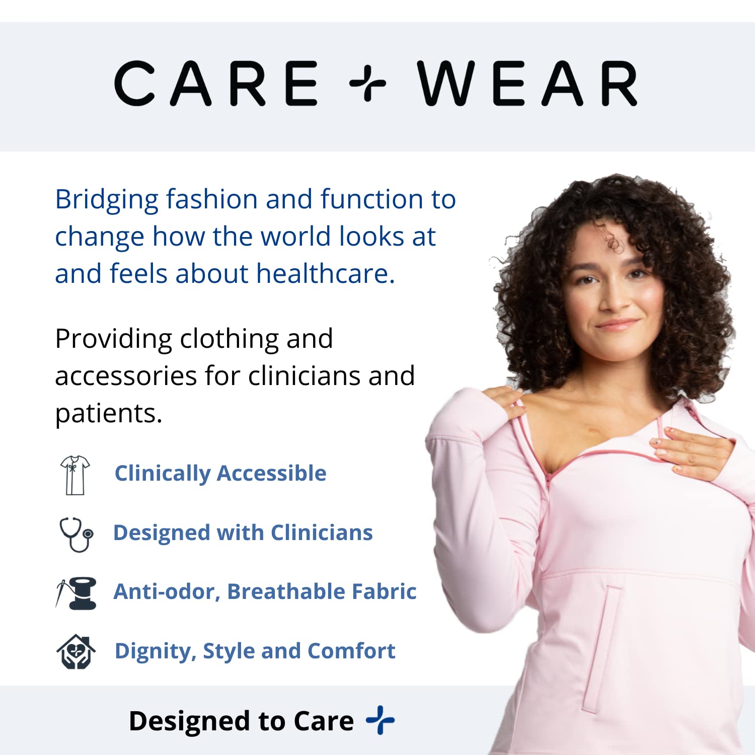 ABOUT US: Working alongside patients, clinicians, and designers, Care+Wear creates functional, fashionable, and medically superior products that promote safety, dignity, style, and comfort. Our goal is to help provide healing solutions for all, regardless of what they may be going through.
