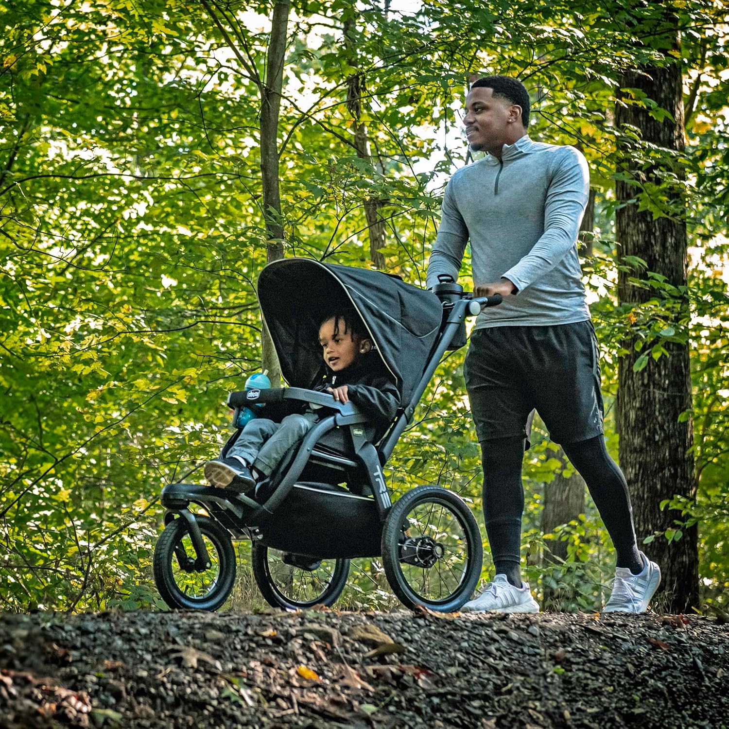 The Chicco TRE Jogging Stroller is designed to keep up with fast-paced families from everyday outings all the way to race day. A lightweight aluminum frame, sleek three-wheel stroller design, deceleration hand brake, and 16″ pneumatic rear tires make it easy to maneuver. Dual FlexCore suspension adjusts for smooth or rugged terrain.
