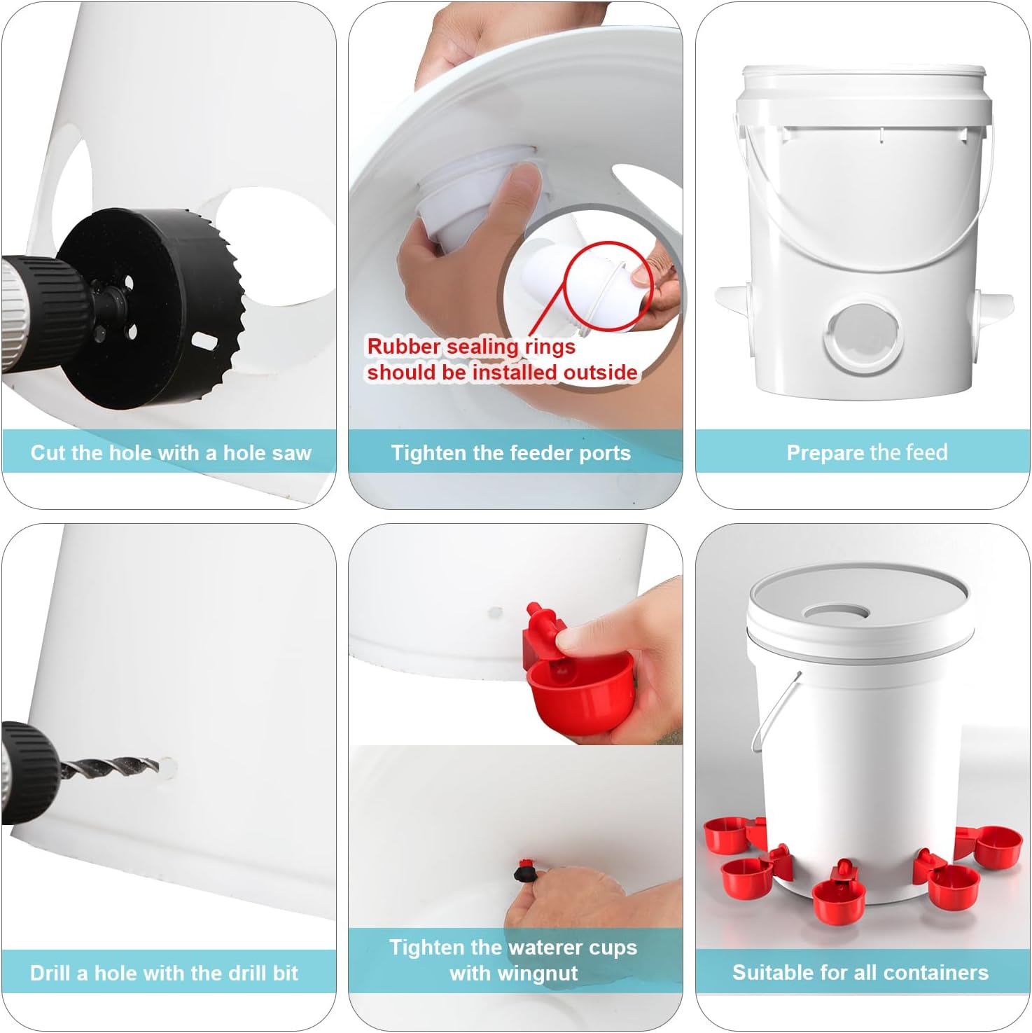 【Perfect Chicken Feeder Kit】:6 Chicken feeders ports and 6 chicken waterer cups,poultry feeder and waterer set(hole saw and drill bit),come with everything you need.