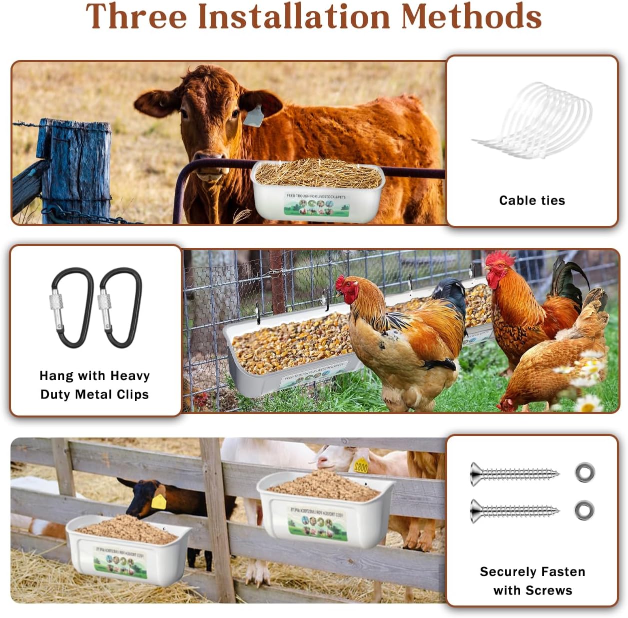 Efficient Feed Trough: Our livestock feeder provides an efficient and reliable way to feed your animals. With its spacious capacity, it can accommodate a significant amount of feed, reducing the frequency of refills. The package includes 2 pack feeder troughs, 4pcs clips, 4pcs screws, 6pcs zip ties, chicken house vegetable bag.