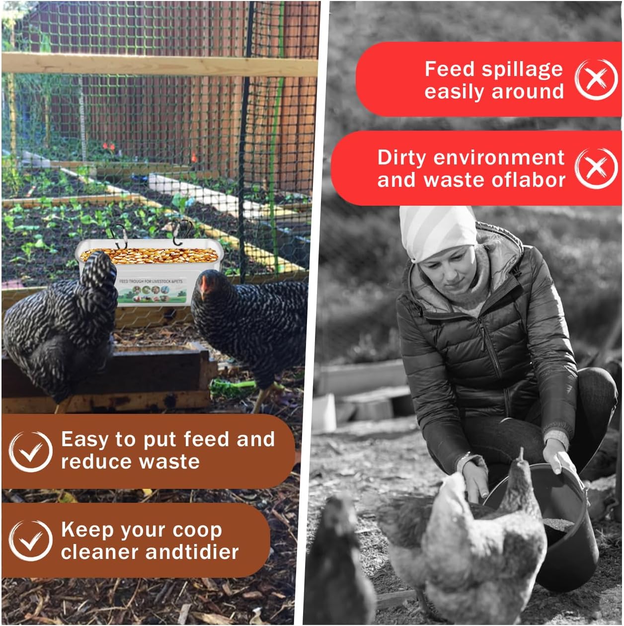 No Waste & No Mess: Our Hanging Chicken Feeder with Clips is designed to minimize food waste and mess. The unique design ensures that the feed stays inside the trough, preventing it from being scattered on the ground or contaminated by dirt and droppings. Keep the feed fresh and dry, promoting healthy eating habits for your chickens.