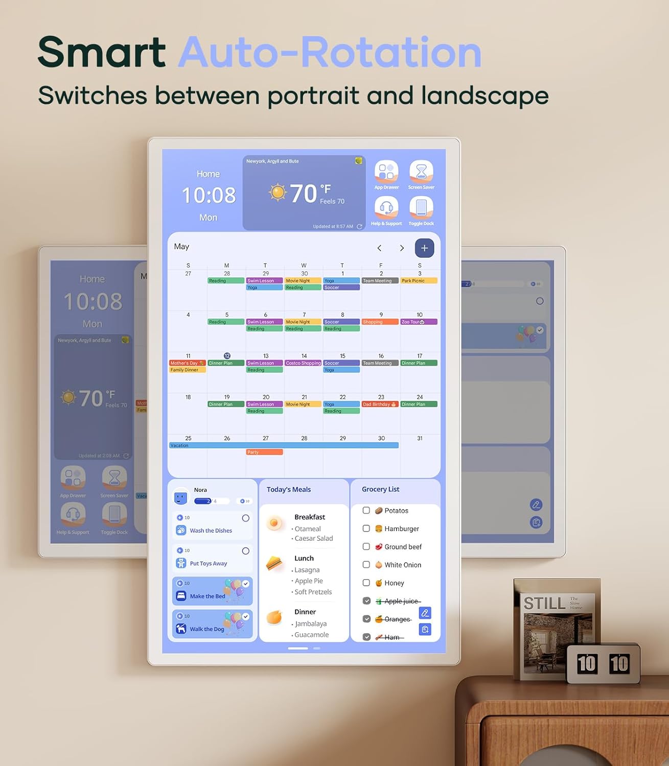 Personalized Dashboard: Drag and drop widgets like calendar, chore chart, meal planner, media player, and weather to create your own custom home screen. You can also download more apps from Google Play to fit your needs.