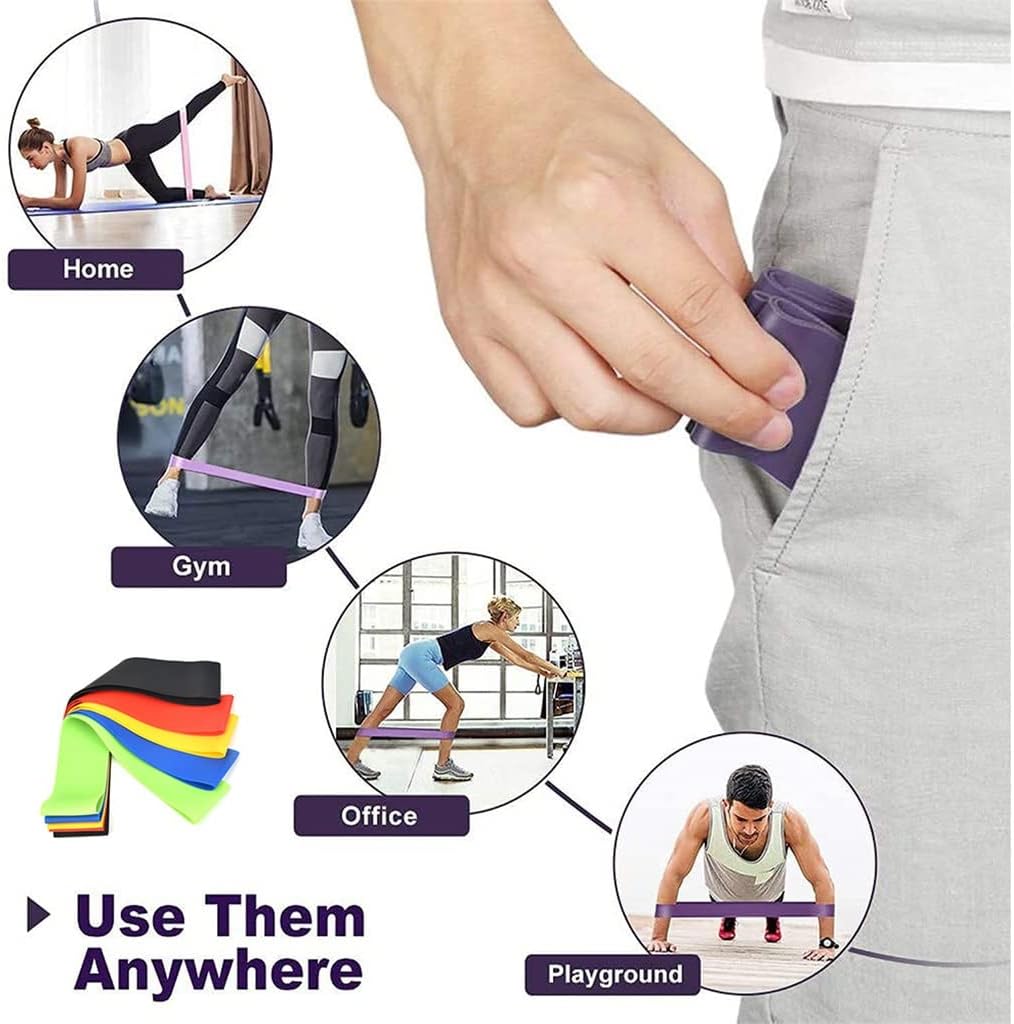 ✦5 different colored stretch resistance bands, each clearly marked with weight indication for different tension ranges: X-LIGHT: 5-10LB, LIGHT: 10-15LB, MEDIUM: 15-20LB, HEAVY: 25-30LB, X-Weight: 30-40 lbs. Use a single band or combine more bands to perform challenging exercise intensities.