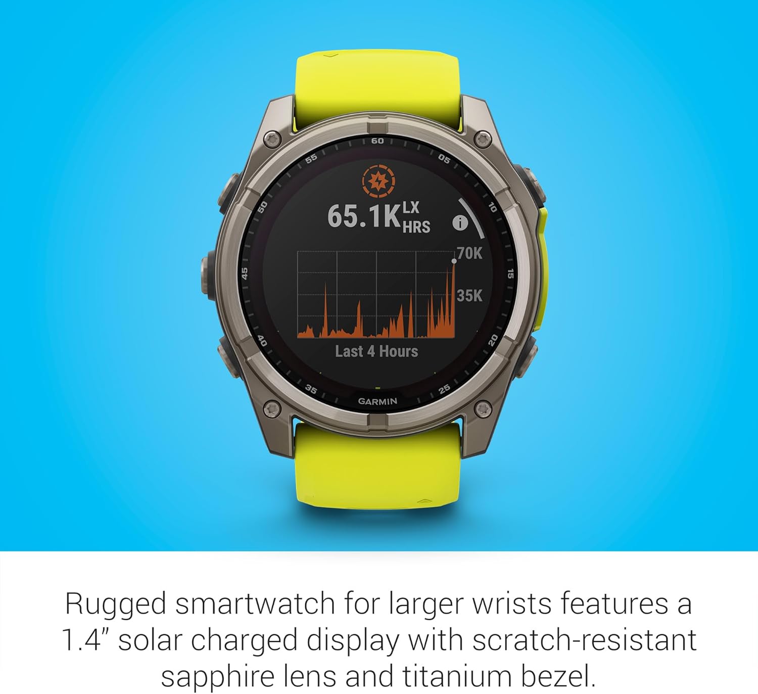 This Bundle Contains: 1 Garmin fenix 8 – 51 mm, Solar, Sapphire, Premium Multisport Running GPS Smartwatch, Long-Lasting Battery Life, Dive-Rated, Built-in LED Flashlight, Titanium with Amp Yellow/Graphite Band + 1 Signature Series Charging Bundle