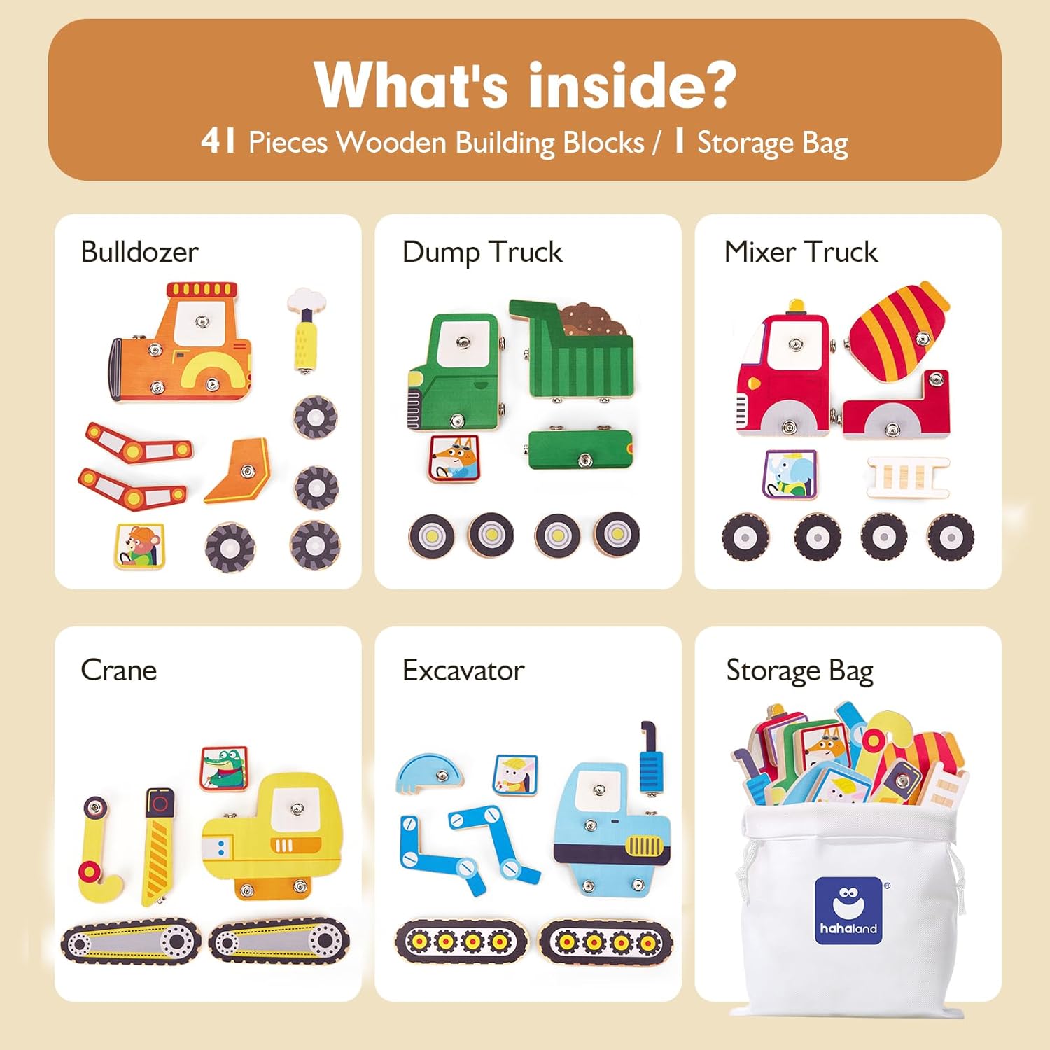 Set of 5 Sturdy Wooden Construction Vehicles: hahaland premium wooden construction set includes 41 interchangeable pieces to build 5 realistic, brightly painted vehicles: crane truck, transport truck, excavator, forklift, and mixer truck. Kids can mix and match parts to design their own creations, encouraging open-ended play and hands-on STEM learning. A perfect screen-free gift for toddlers and preschoolers