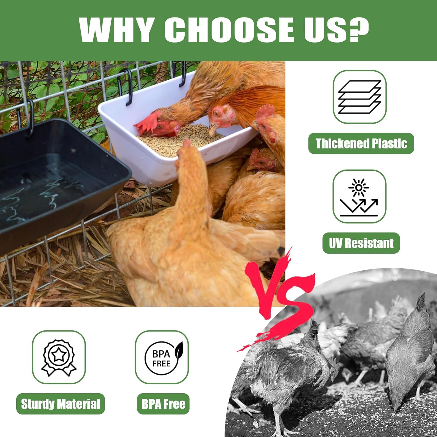 【Durable and Safe Material】Our chicken feeders are made of safe polyethylene resin, with a sturdy structure, not easy to deform or break, and can resist external factors such as weather to provide you with long-term service. Duck feeders are BPA-free to ensure the safety of livestock food and water, and you can use it for poultry animals with confidence.