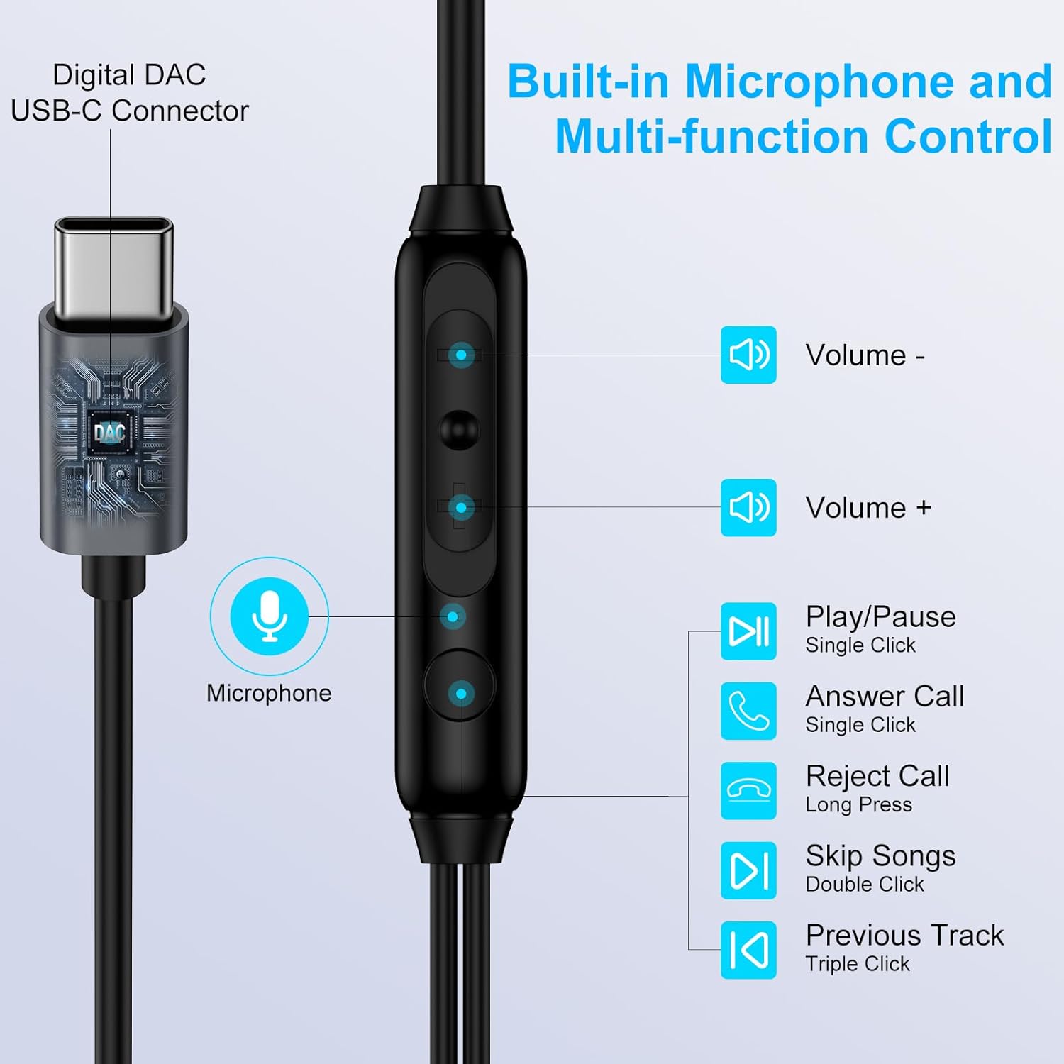 【HiFi Stereo & Noise-Isolation】type c headphones wired built-in advanced robust DAC chip ensures iphone 16e/16 pro max up to 96kHz high resolution acoustics, wired earbuds with microphone offers 24-bit noise canceling and improved lossless high fidelity audio, and ear phones with cord improves the output sound quality. corded earbuds is not any buzzing, popping, or audible distortion. c port a36/a26 headphones properly surround the sound in your ear, wired google pixel 9a headphones allow you to enjoy a complete listening experience.