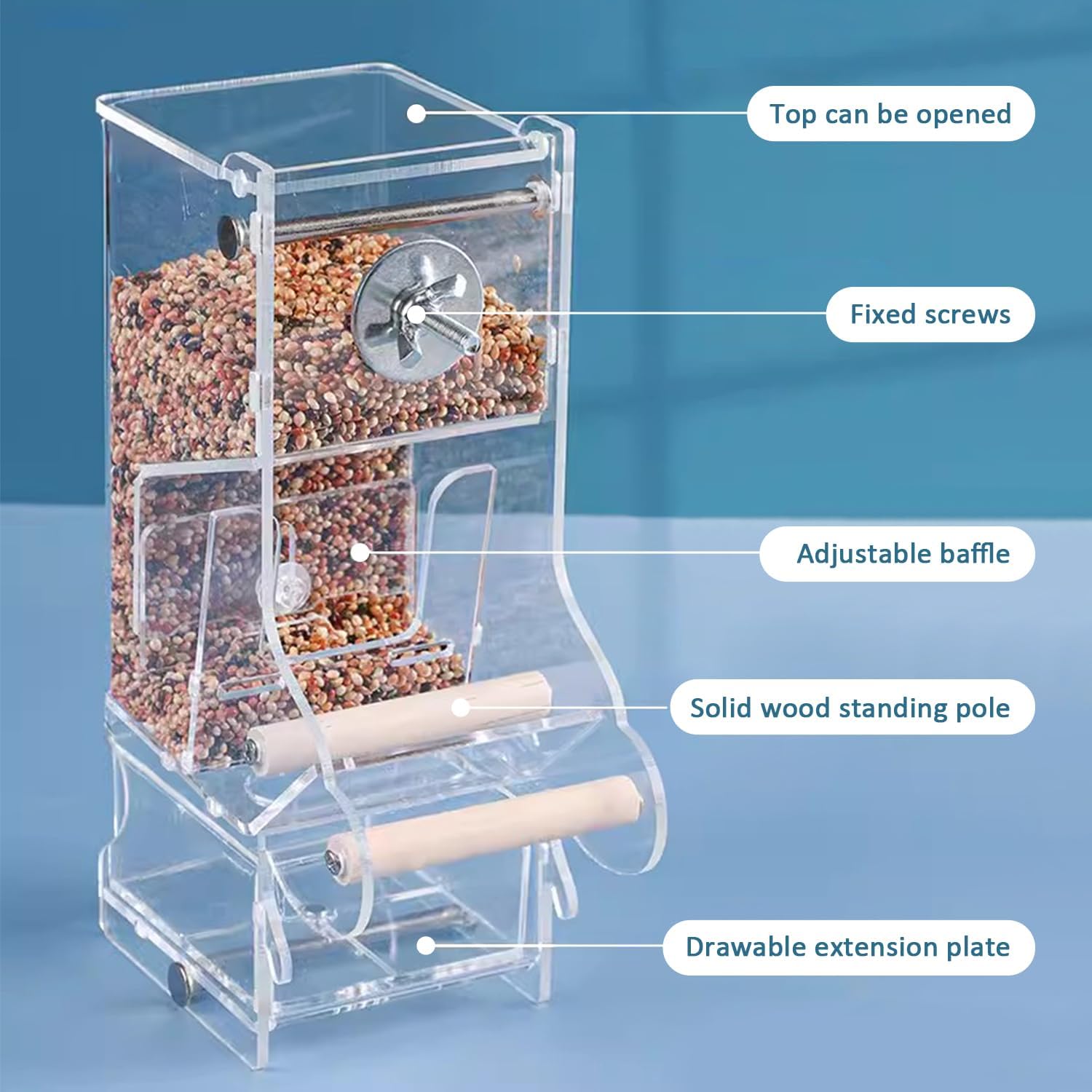 Featured with an adjustable baffle, the feeder can control food spill speed based on bird’s actual needs, thus preventing food waste.