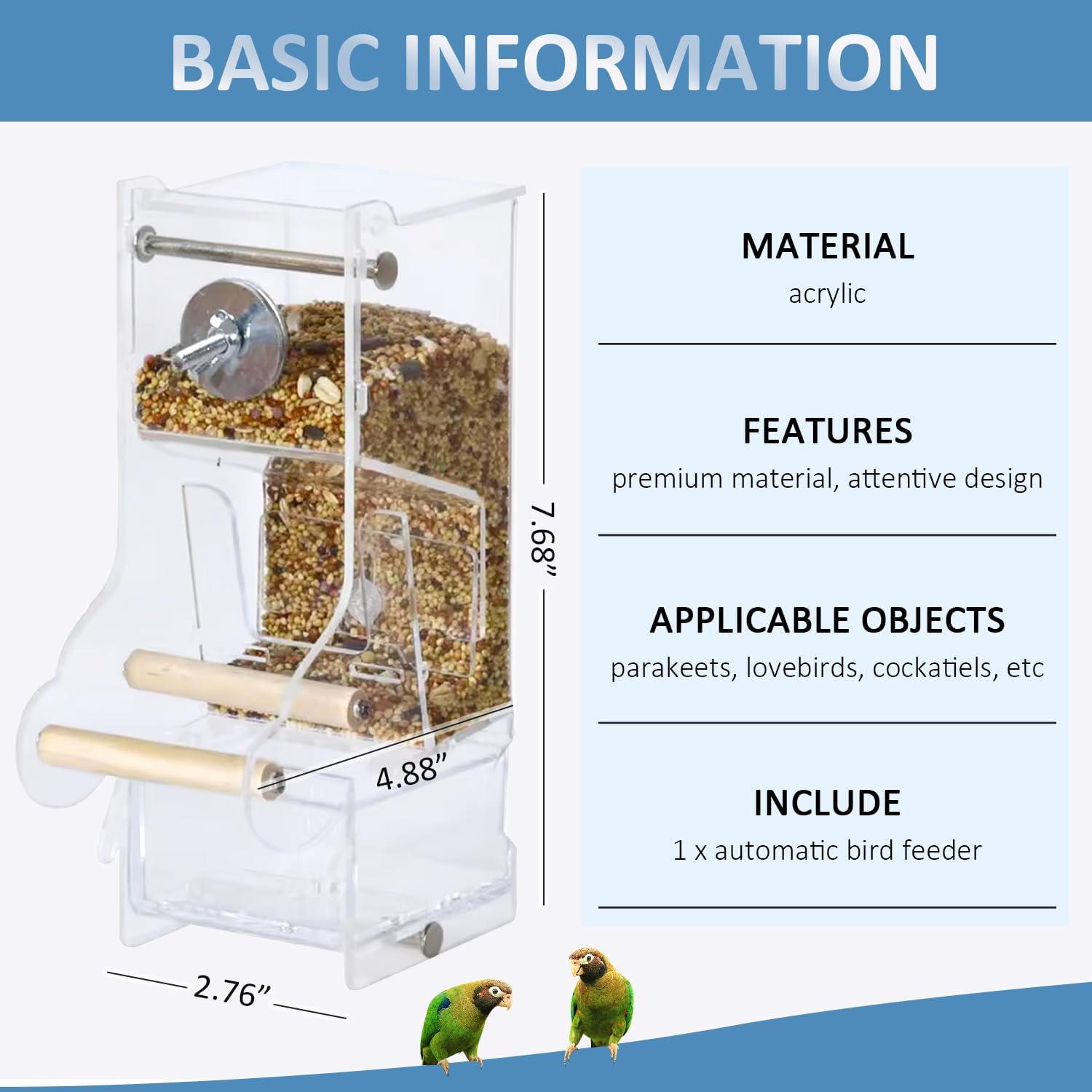 MATERIAL & SIZE: The feeder is made of highly transparent acrylic material, allowing you to easily observe the quantity of food and replenish it. With a size of 2.76 inches/7 cm in length, 4.88 inches/12.4 cm in width and 7.68 inches/19.5 cm in height