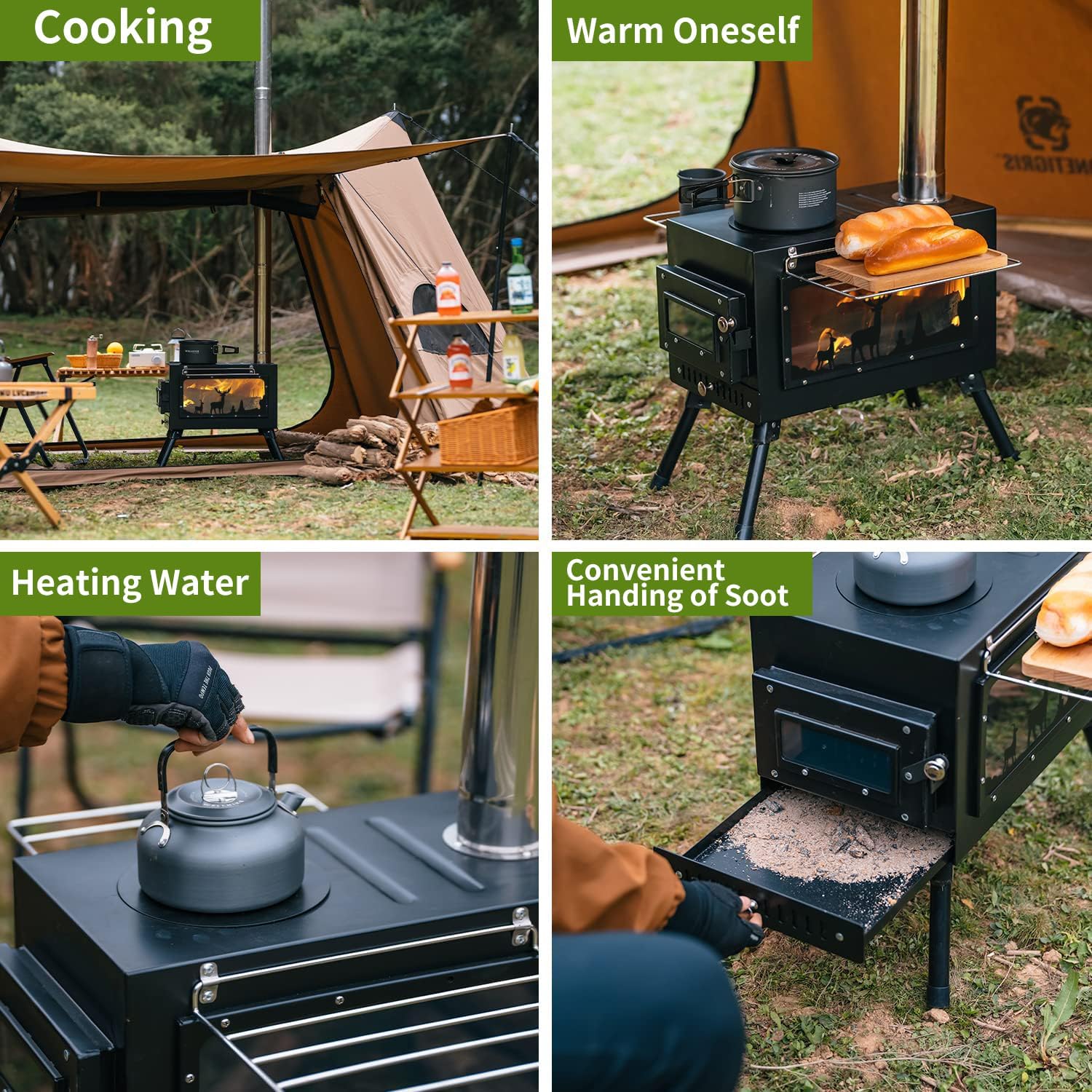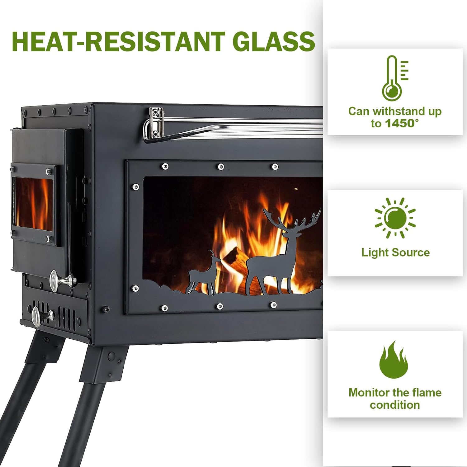 【Smoke-Free Heating with Adjustable Control】Stainless steel chimney directs smoke upward for cleaner air and works with -tent vents. Optimize fuel efficiency using the damper to regulate heat output, and monitor flames through the removable window for safer, longer-lasting burns.