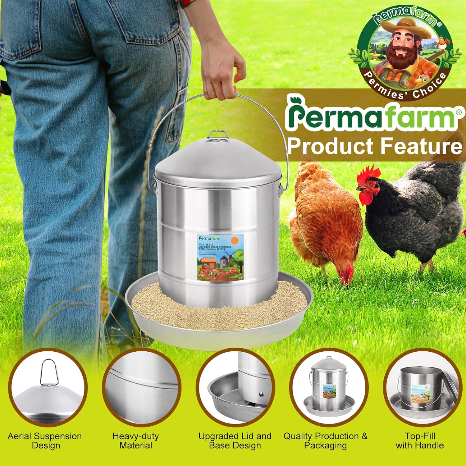 Premium 304 Food-Grade Stainless Steel Construction: Crafted entirely from high-quality 304 food-grade stainless steel, our feeder is rust-free, ensuring your chickens always eat from a safe and clean source.Continuous Feed Supply: Our feeder uses an automatic design to deliver a continuous and reliable feed supply. This means less work for you and constant nourishment for your flock.Heavy-Duty 0.9mm Metal Thickness: With a robust 0.035-inch (0.9mm) thick stainless steel construction, our feeder is built to withstand the demands of farm life. It resists dents, deformation, and damage, even if accidentally dropped.Easy to Clean and Refill: Featuring a removable top lid, our feeder is incredibly easy to clean and refill. This user-friendly design saves you time and effort, making poultry care a breeze.Trusted by Permaculture Farming Communities: Designed and tested to meet the high standards of permaculture farming, the Permafarm Chicken Feeder is a reliable choice for sustainable poultry care.