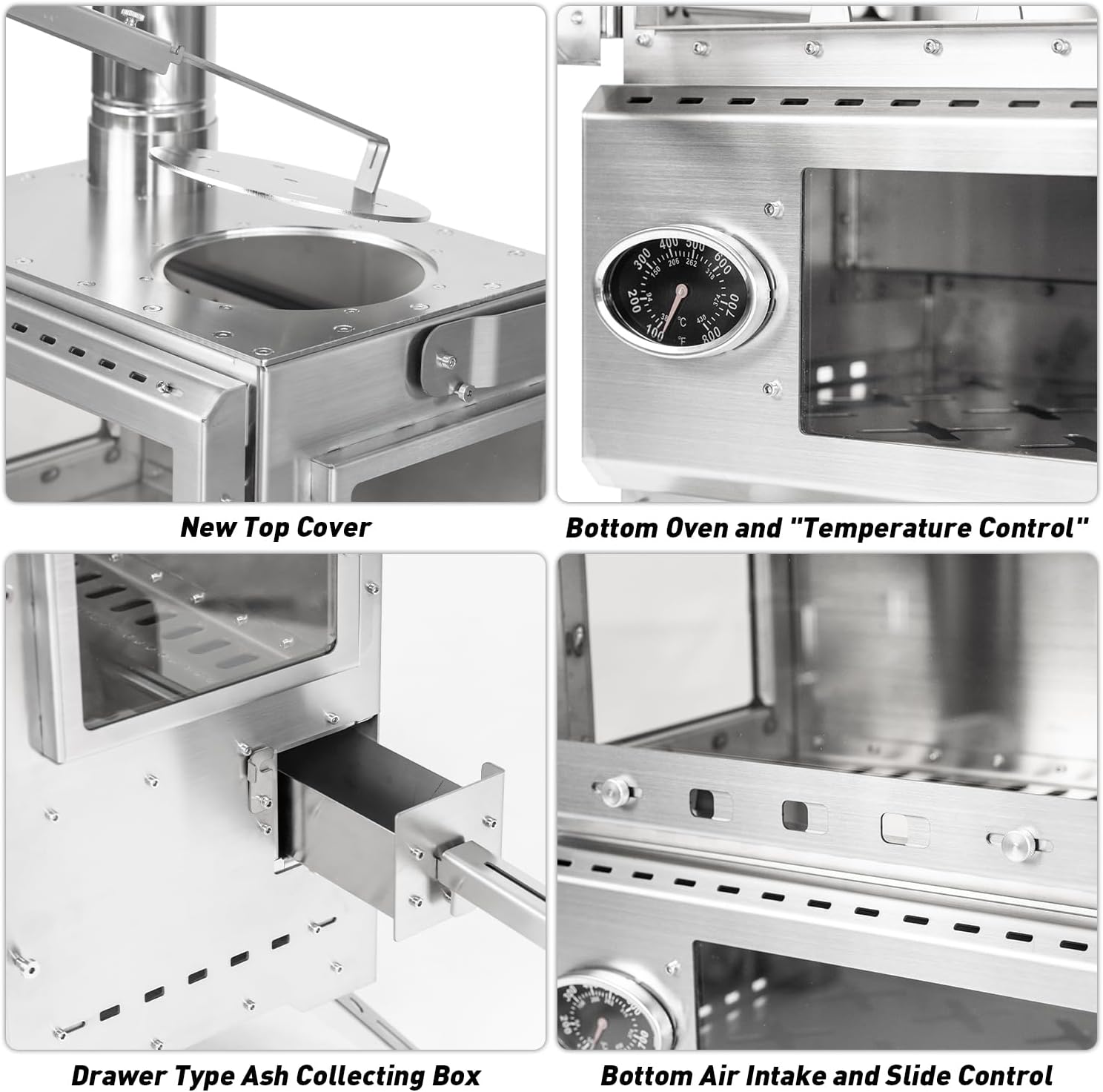 【Oven Area Design】Oven wood stove is designed in two parts, upper and lower. The sliding switches on both sides of the top and bottom of the oven can control the air circulation inside the oven, thereby achieving the effect of controlling the temperature inside the oven. After outdoor testing, if your firewood is wet, it is best to turn off the oven exhaust so that the oven temperature can gradually rise, otherwise turn on the switch to prevent the food from being burnt due to excessive temperature.