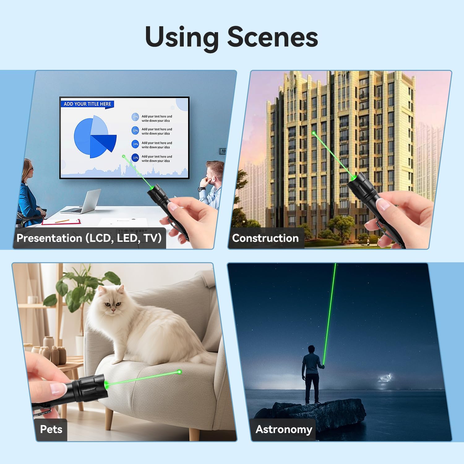 [Starlight Pattern] Press down the star cap and rotate it to remove the star cap, then you can see a straight green line in the dark, and you can see different starlight patterns when you install the star cap. You can use it in many situations, such as construction sites, outdoor adventures, classrooms, meeting presentations, and other fun uses.[003]