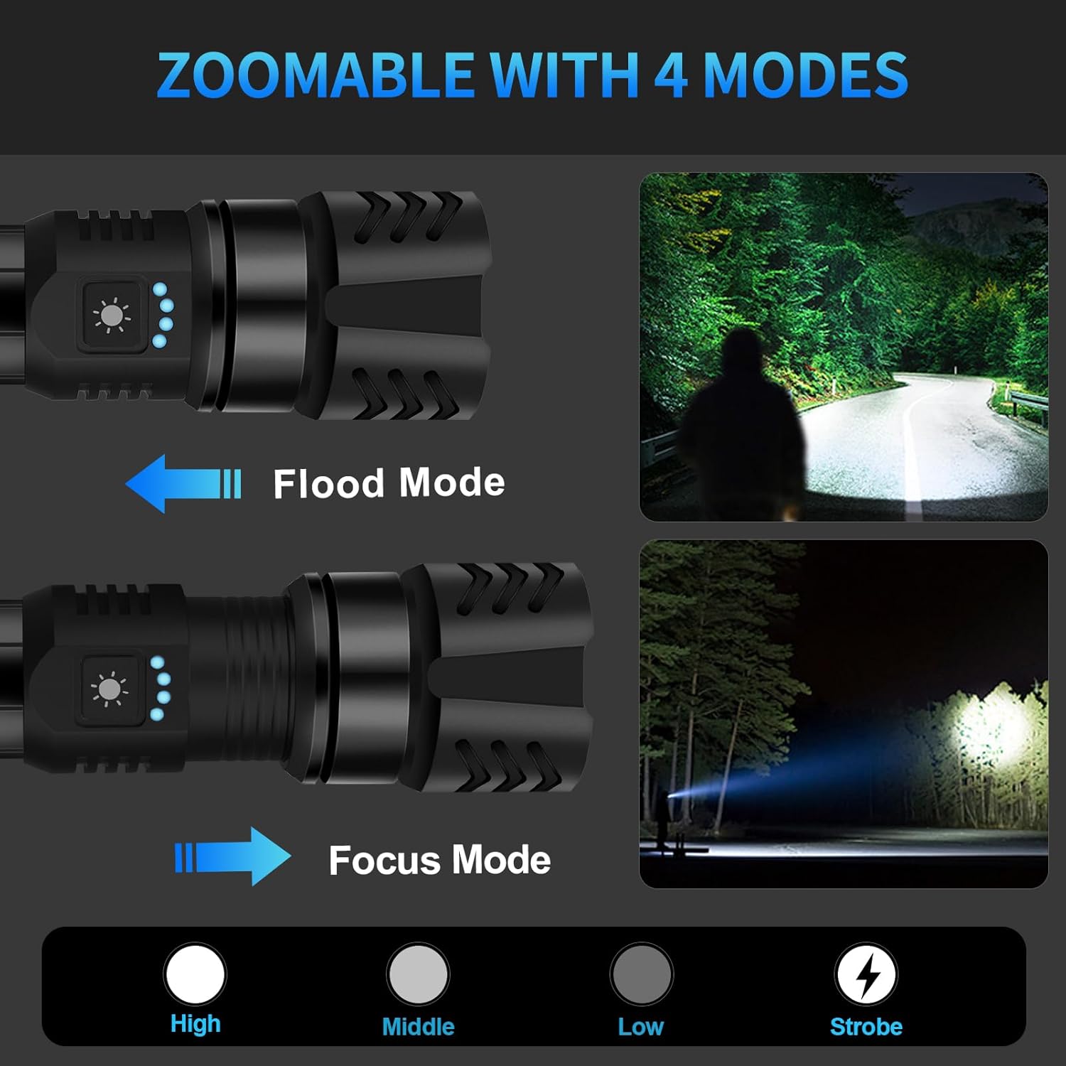 Rechargeable Flashlights: This tactical flashlight equipped with 4000mAh lithium batteries, which can work up to 16 hours after fully charged. Features fast Type-C charging to ensure high efficiency. It also can reverse charging to power your electronic devices in emergency, compatible with any USB connector. With 4 power indicators assist you to know the battery level