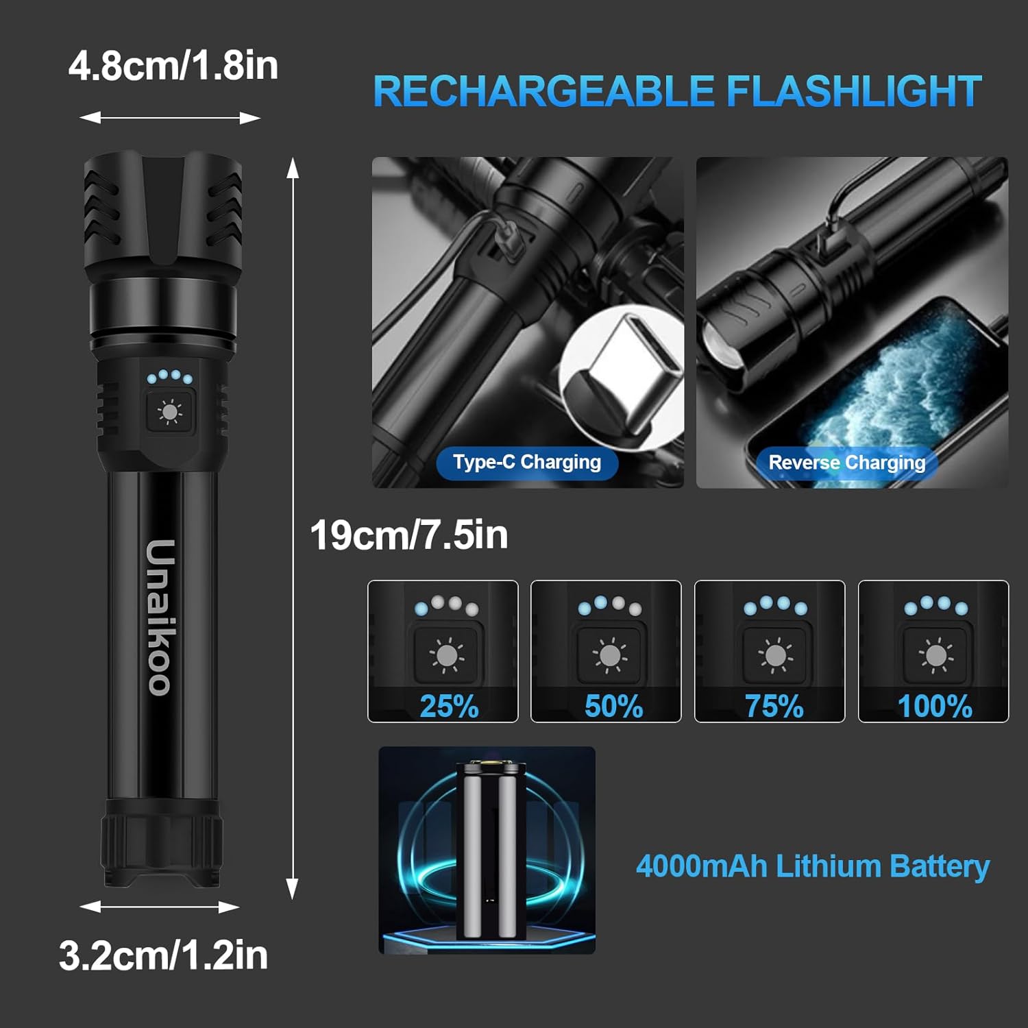 Flashlights High Lumens: Unaikoo flashlights are are equipped with a super bright LED chip which can produce up to 10,000 lumens brightness. With high powered flashlight, meeting your various illumination needs, lighting up to two football fields area or 5,000 feet distance, perfect for emergencies, camping, hiking, outdoor, etc.