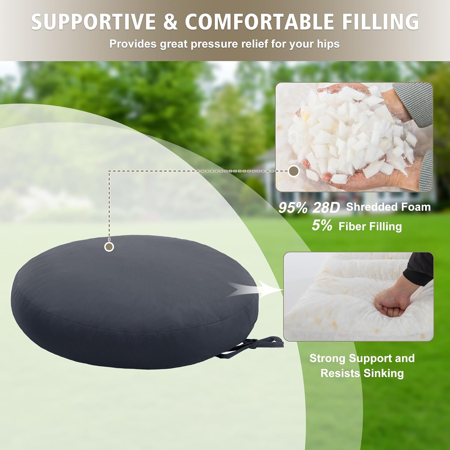 【All-Day Comfort with Premium Foam】Each cushion is filled with 28D high-resilience shredded memory foam, offering lasting comfort and support for long outdoor lounging. Ideal as a seat replacement pad for outdoor dining chairs, wicker patio furniture, or backyard sofa setups.