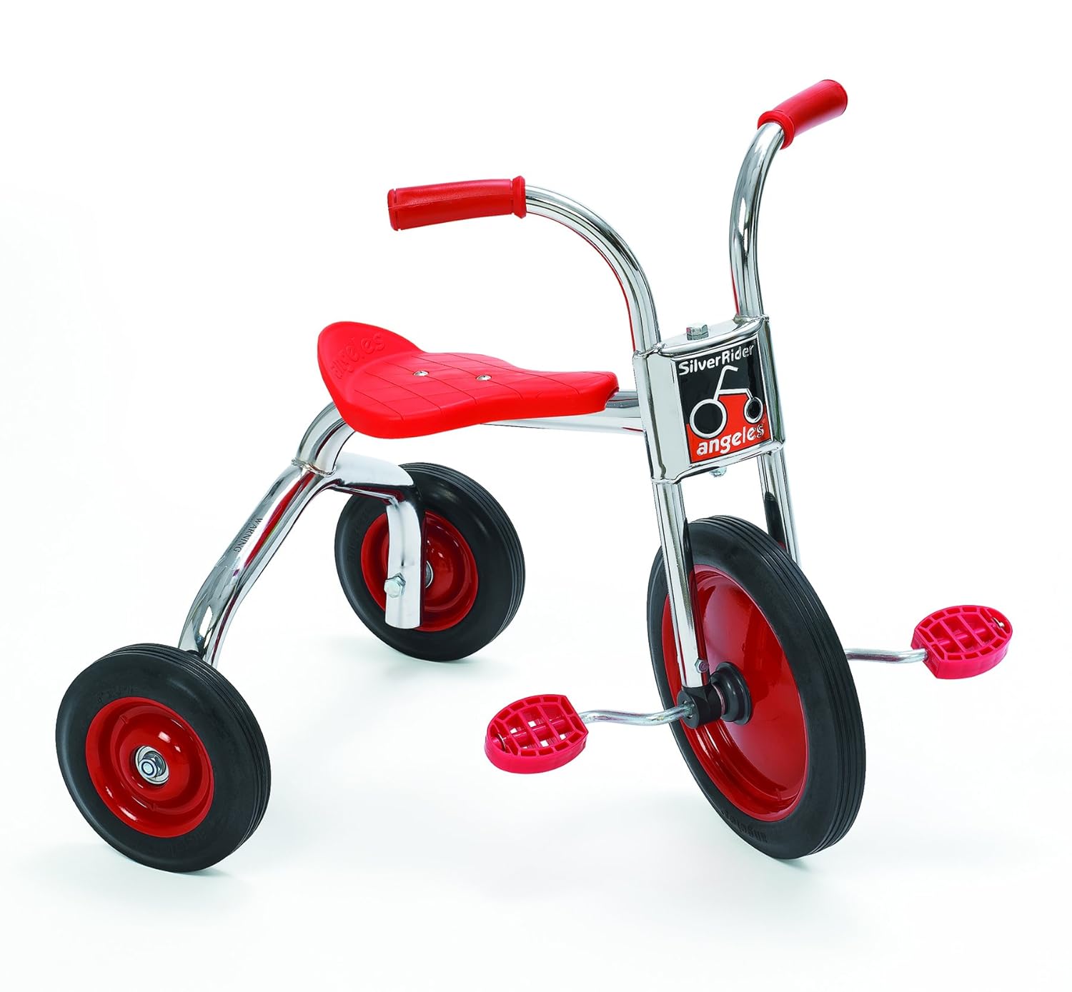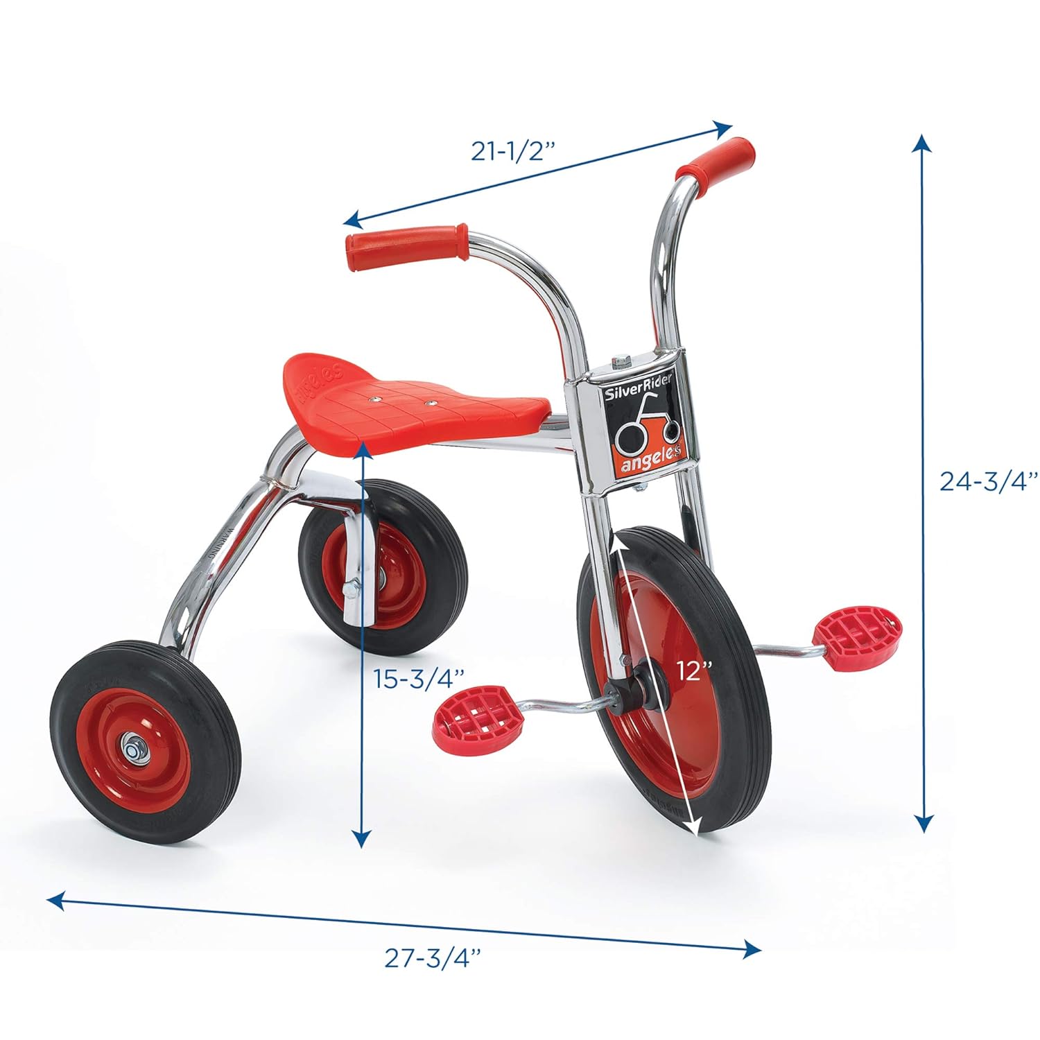 The SilverRider 12” Pedal Pusher features a classic black and red design and a variety of safety features that are perfect for beginning riders! The SilverRider learning trike features durable chrome plating and a welded steel frame with bright primary red accents, ideal for children 3 years and older. The seat measures 15¾ inches height, the front wheel measures 12 inches in diameter, and the handlebars measure 24¾ inches in height. The trike has non-exposed pedal hardware, solid rubber tires and self-lubricating nylon bearings. Young children up to 70lbs will enjoy riding around the playground, daycare center, or backyard with ease. The toddler tricycle comes fully assembled and measures 27.75 x 21.5 x 24.75 inches. Nostalgic memories will come rushing back as you watch your little one ride this classic red trike, don’t let your children miss out on those same wonderful memories of your past! To ensure the trike stays in the best condition, we recommend storing the red tricycle indoors.
