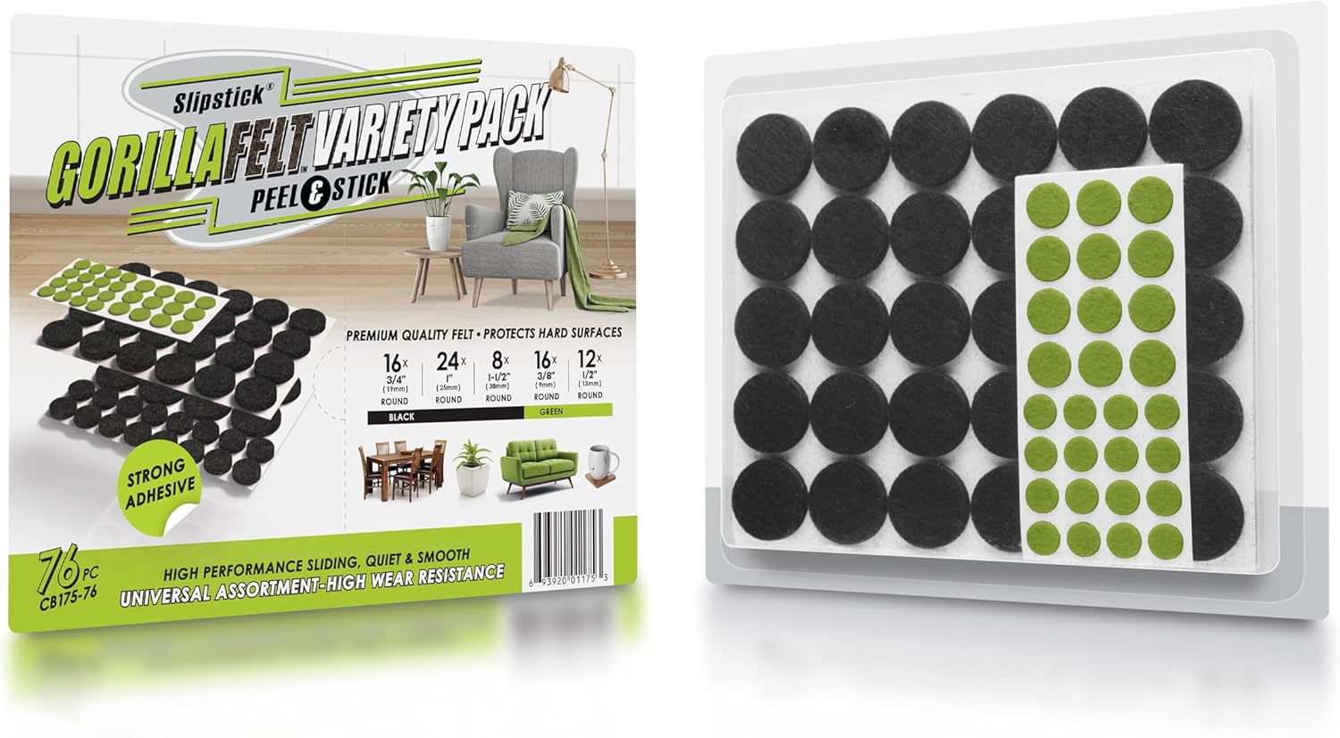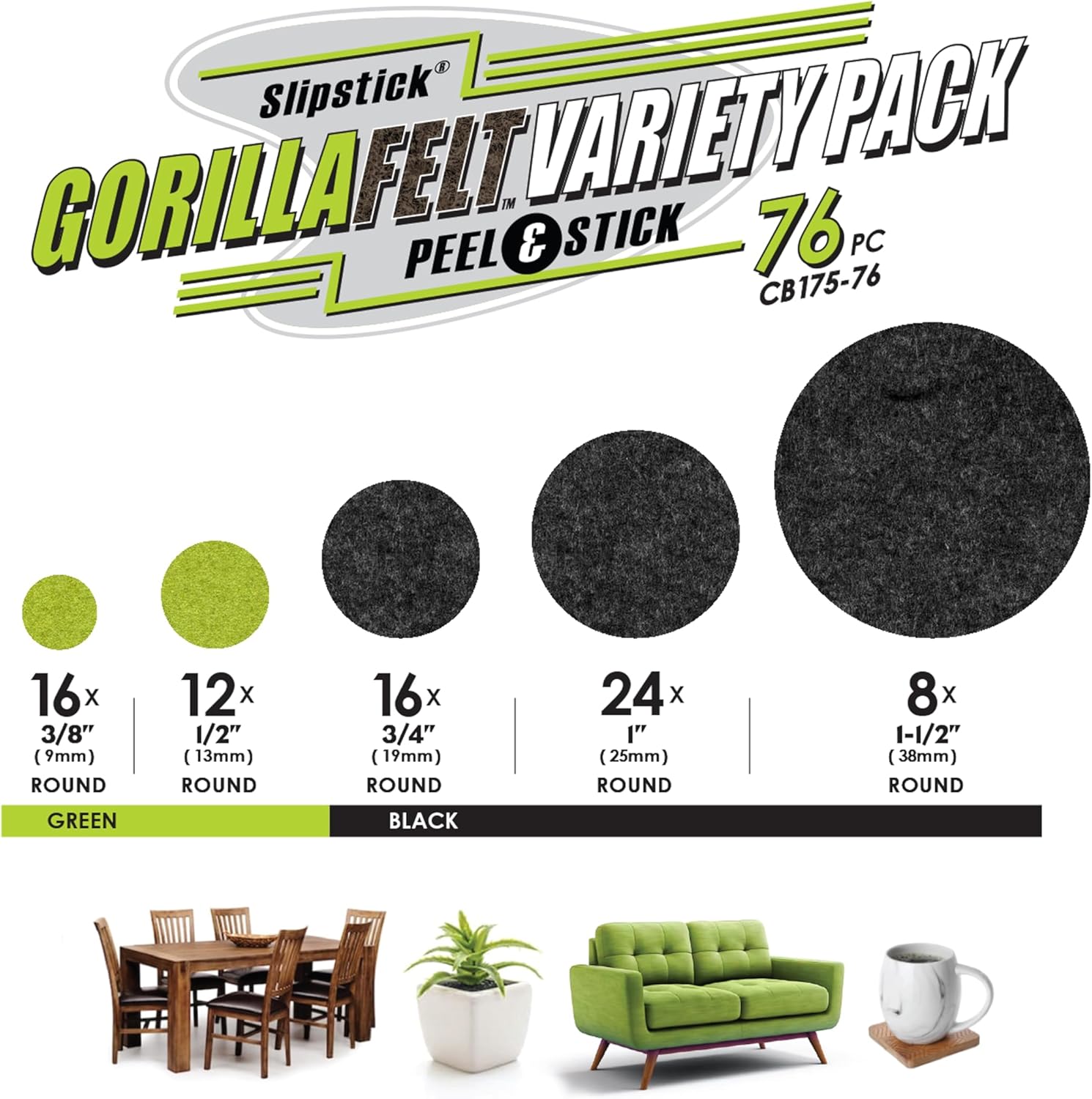 76 Piece felt pad variety pack– This variety pack of Gorilla Felt floor protectors includes (16) ¾” round, (24) 1” round and (8) 1-1/2” round black felt pads for furniture as well as (16) 3/8” round and (12) ½” round green felt pad surface protectors for décor and small items.