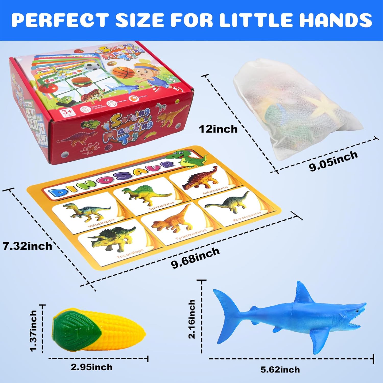 2 In 1 Educational Game: Comes with 6 wild animals, 6 dinosaurs, 6 engineering vehicles, 6 fast foods, 6 fruits, 6 balls, 6 sea fishes, 6 vegetables, making it versatile and engaging for kids of all interests. The vibrant colors and realistic designs of the animals and objects help children easily recognize and classify them. It helps to improve kid’s cognition ability, problem-solving skills and fine motor skills.