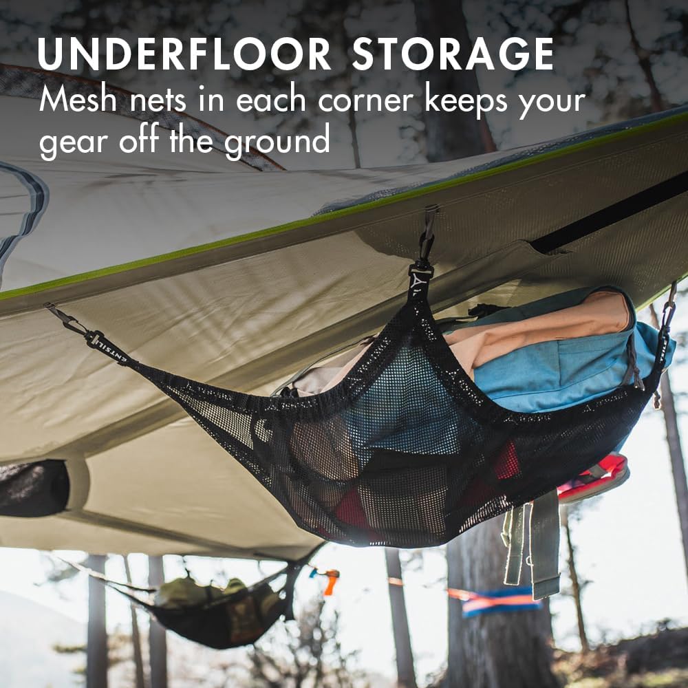 PORTABLE + DURABLE: unique 3-point anchoring system creates tension giving you a taut fabric base to sleep on, tent floor has the perfect amount of give to cushion and cradle your body for an unmatched night under the stars