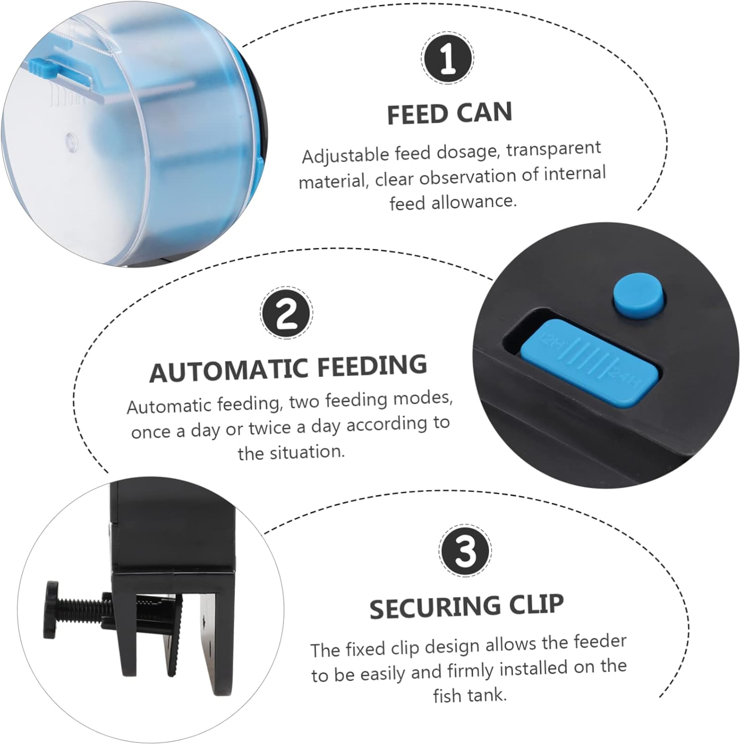 – The suitable feed tank can be selected according to the feeding amount of the fish tank Fish Feeding Device.