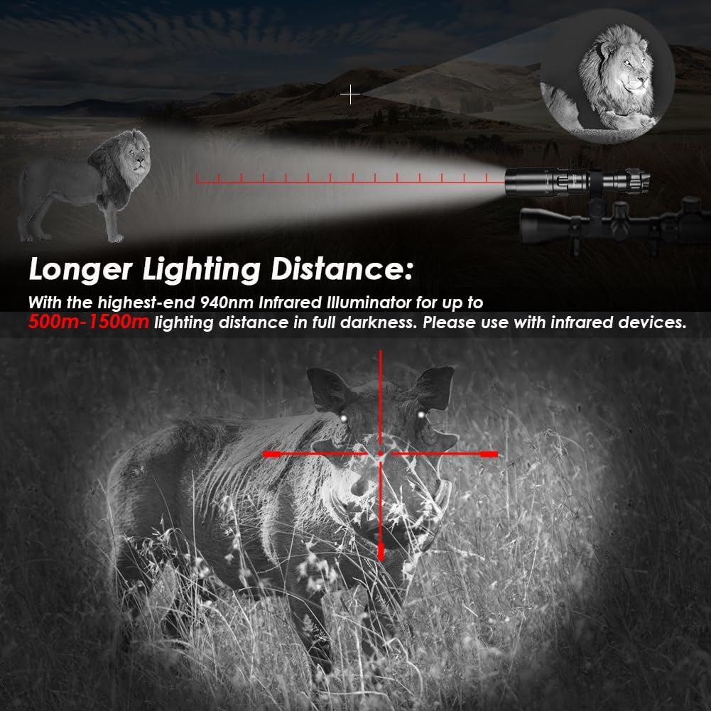 In order to go night hunting using NV, a night vision scope paired with an infrared light, or IR illuminator is needed to see targets in complete darkness.