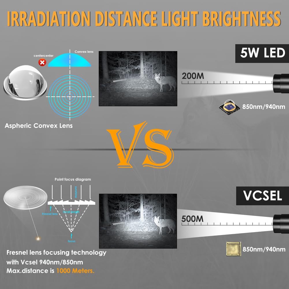 【Fresnel Lens Focusing Technology】Our IR Flashlight Uses Fresnel Lens Zoomable Focusing Technology,Utilize the short focal length microstructured Fresnel optics which can be more focused,The light penetrates more strongly, fresnel lens is thinner than the ordinary lens can shine much farther than, and the maximum illumination distance can reach 500 meters.