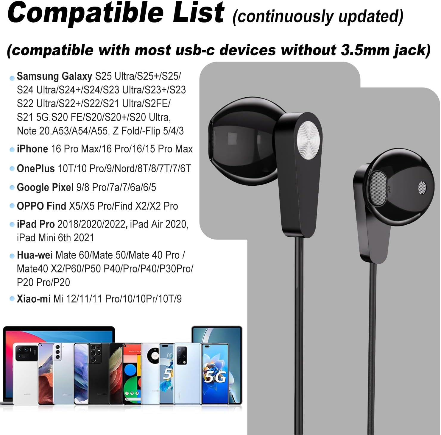 USB C Headphones with Microphone for iPhone 16,16 Pro,16 Plus,16 Pro Max,15,15 Pro,15 Pro Max, for Samsung Galaxy S24,S24+,S24 Ultra,Z Flip 6,Z Fold 6,S23+,S23 Ultra,A53,A54,A55 ,A34,S22+,S22 Ultra,S21 FE,S21+,S21 Ultra,S20 FE,S20 Ultra,S20+,Tab S9,S9+,S9 Ultra,S8,S7, for Google Pixel 9 Pro,9,8 Pro,8a,8,7 Pro,7a,6 Pro,6a, for Motorola Razr 50 Ultra,Edge 50 Pro,Edge 50, for OnePlus 12,Open,10T,10 Pro,9,Nord,8T, for Asus Zenfone 11 Ultra ,ROG Phone 8, for Oppo Find X6 Pro,Reno 10 Pro, for Sony Xperia 5 V,1 V, for Xiao-mi 13 Pro,14 Ultra, for Hua-wei Mate 60 Pro, for Realme 12 Pro,GT 5, for Macbook Pro,iPad 10,iPad Pro,Mini 6,Air 5 6,for Nothing Phone and most USB-C devices without 3.5mm jack
