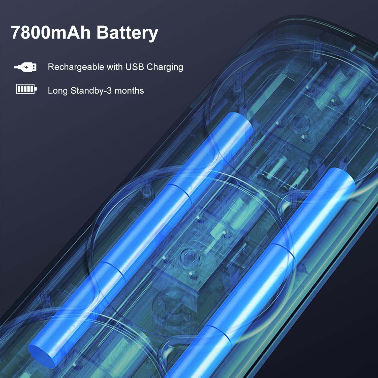 LONG BATTERY LIFE: 7800mAh battery. Rechargeable with USB Charging. Charging time: 3H, usage time: 10 minutes each time, can be used for about 45 days.