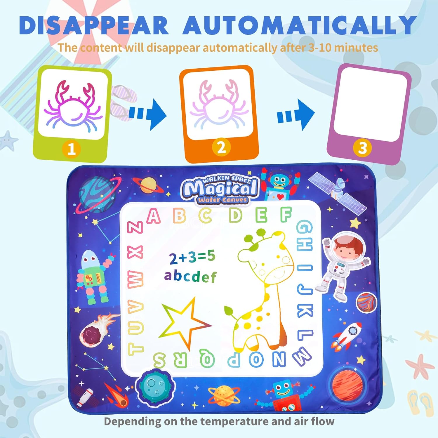 【Reusable & washable water doodle mat】Different from traditional paint by crayons on table or painting by pen on easel.BBnote water doodle mat can be placed freely on the floor board,it is children’s great interactive games set.Child can free draw on the mat by filling their pens with water, and after 3-10 minutes, the color arts will magically disappear (depending on temperature and airflow).It is a washable toy that won’t mess up the house and is also easy to cleaning.