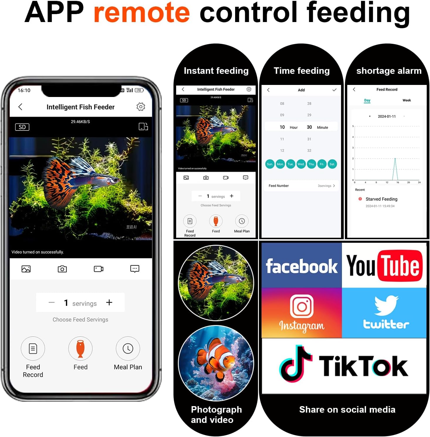Smart WiFi and App Control for Worry-Free Feeding: Effortlessly manage feeding schedules for your aquarium with this premier automatic fish feeder. Remotely adjust portions, meticulously regulate feeding times, and monitor your aquatic environment from anywhere. This vacation fish feeder guarantees timely nourishment, resolving absence-related issues while offering social media sharing options.